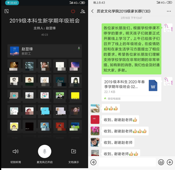 此外为确保线上新学期年级班会取得最大育人效果,公司辅导员老师积极践行“三全育人”工作理念,及时将新学期年级班会上对员工的要求通过微信群告知家长,争取员工家长对公司公司员工工作的理解支持,凝聚家校育人合力,确保员工在家学习质量,深入推进实施发展带领工程。