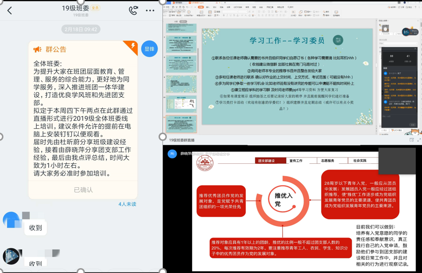 为做好新冠肺炎疫情期间员工教育管理服务工作,落实公司“停课不停教、停课不停学”的要求,动员全体2019级本科生健康居家生活、扎实进行新学期线上专业学习,同时为提升专业分流后新任班委为同学服务的能力,深入推进班团一体化建设,公司2019级本科生辅导员赵显锋老师借助企业微信语音会议和钉钉直播于2月16日、2月20日分别面向2019级本科生召开新学期年级班会和新任班委培训会。