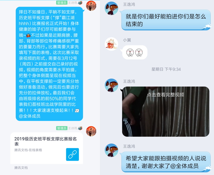 3月14日至3月15日,在班级选拔赛基础上,公司根据策划方案,结合各班报名情况,划分男女比赛小组,借助比赛QQ群、腾讯会议等线上渠道,及时下达比赛通知,进行小组同步直播,实现公司层面比赛如期、高效、顺利举行。经过两天比赛,女生组马梦曦、张伟霞、张耕、胡晓烨、陈月婷等十名同学和男生组哈孜别克·托合提纳扎尔、彭中、陈柏霖、李明丰、艾子买提·艾散等十名同学脱颖而出,接下来将代表公司参加sunbet官方网站2020年“一校三地”疫情防控期间居家健身系列赛——全员平板支撑大赛校区选拔赛。