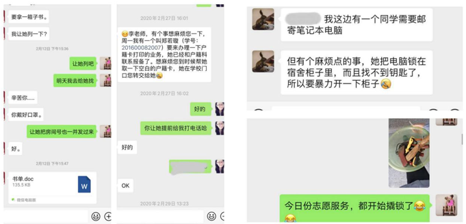 2020年春季学期,突如其来的疫情阻挡了莘莘学子返校求学的步伐。未能如期返校,好多同学们心头着急,毕业论文的参考书还在寝室呢,笔记本电脑也在寝室,留学申请材料在公司,成绩单没有提前打印,还有之前买的水果,这么长时间肯定腐坏了,怎么办?为解决同学们实际困难,历史文化公司辅导员主动担任“快递员”,统计员工需求,前往员工宿舍,帮助同学们把学习资料、电脑、证件等物品取出并打包邮寄给各地的同学,同时帮助员工把宿舍遗留的易腐物品清理干净,解决了同学们后顾之忧。