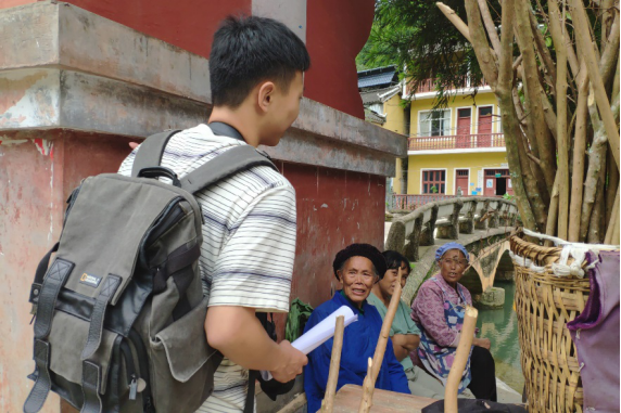 第二天,在当地人的指引下,同学们到达布依族苗族聚居的民族村——香车河进行走访调研。在走访时,一位热心的古稀老人为同学们展示了传统布依族服饰的生产过程,加深了同学们对这一工艺的了解。