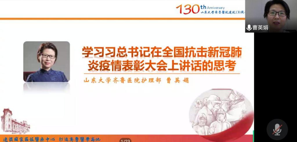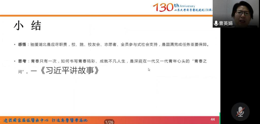 在提问环节,曹英娟主任对于同学们的提问进行了悉心解答,她分享了自己从医多年来的初心与信念及其对援鄂行动的支持和助力,通过自身的经历对理解和传承山大人精神给予了深刻诠释,并对同学们在日常生活中进行常态化抗击疫情给出了温暖的建议和指导。令同学们深受启发和感动。