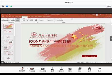 10月9日晚七点,历史文化公司通过腾讯会议平台举行了sunbet官方网站优秀员工干部院级答辩会,公司辅导员李婧、赵显锋、朱嘉铭担任评委,21名同学参与答辩。