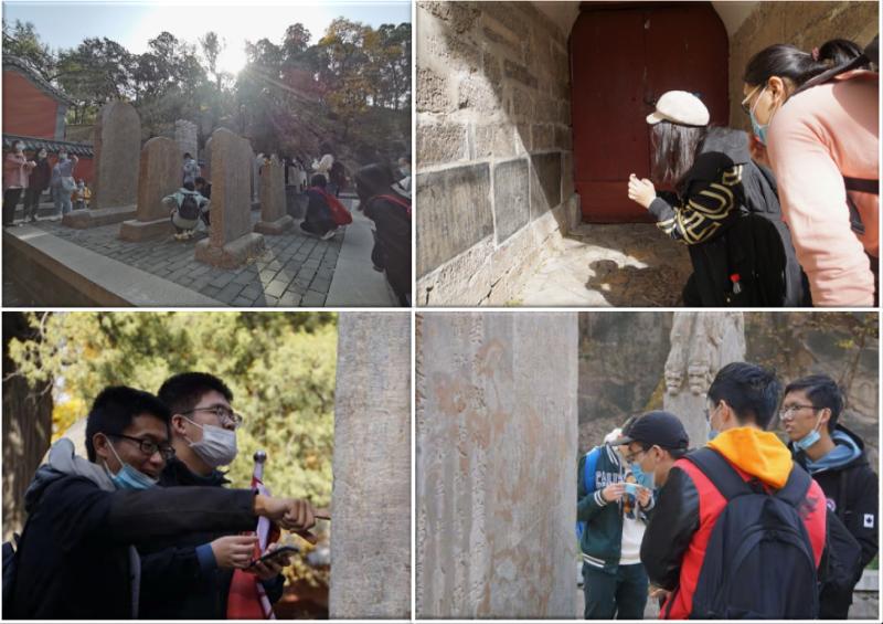 解说结束后,同学进入午饭与自由活动的时间。简单而其乐融融的午饭过后,在班主任老师带领下同学们开始组队爬山,向方山上的摩崖石刻进发。山路崎岖,大家一路上相互扶持、相互鼓励,在歌声与讨论声中游览了袈裟泉、一线天、红门、白云洞等景观,最终顺利到达山顶一览风景。历史学专业的同学们对佛教在中国的发展过程进行讨论;考古学专业、文物与博物馆学专业的同学则纷纷在碑文面前驻足,仔细钻研石碑上刻画的每一个字符;文化产业管理专业和档案学专业的同学则开始研究灵岩寺景区的旅游文化产业和档案管理等。大家各有其志,各得其所。