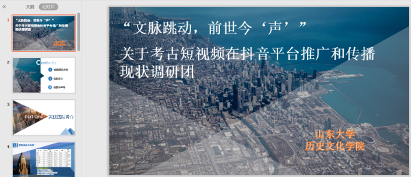 调研团具体活动负责人朱嘉铭详细介绍了本次社会实践活动的具体方案及个人分工情况。她表示,通过此次调研活动,可以对考古遗址保护的相关进程有一个更为细致的了解。本次调研活动以山东、陕西和四川三个文物考古遗迹大省为依托,立足抖音短视频这一平台,了解当地民众对遗址利用方式和对公众考古研究的认可度,从而分析出如何才能使遗址的利用保护真正让公众受益。如何让公众更好地了解与支持考古工作的开展,从而推进大遗址的保护利用,达到雅俗共赏这一目标,则成为文脉传承的重要抓手和公众宣传教育与精神生活的重要支撑。