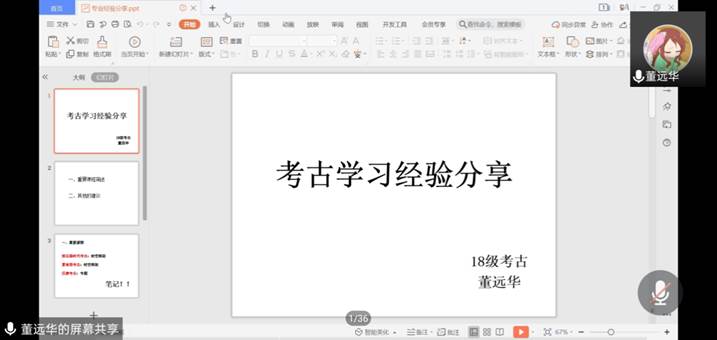 随后,2018级考古专业董远华分享了考古专业学习的经验。董远华从新石器时代考古、夏商周考古、汉唐考古等不同考古阶段入手,讲述了考古专业的学习方法。她提出了时空框架划分和专题划分两种构建知识框架的划分方法。她认为考古专业的学习,不仅要认真做好课堂笔记,而且要紧跟考古前沿,多关注考古界的最新发现。最后,她强调了英语对考古专业的重要性,推荐了一些考古专业相关的公众号和网站。