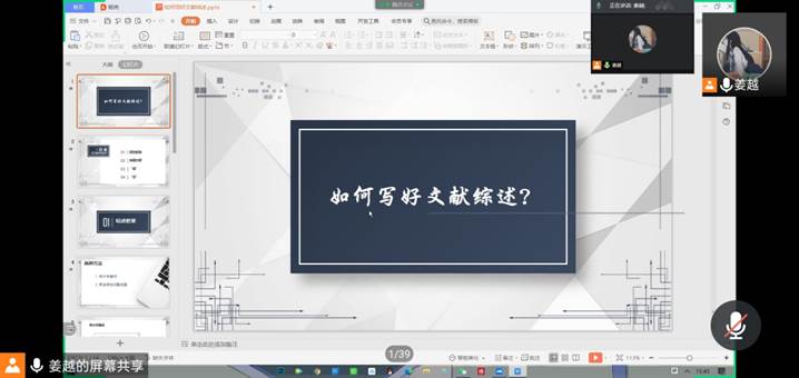 最后,2018级文化产业管理专业姜越分享了如何写好文献综述。姜越针对如何构建文献综述框架,分享了拆分关键词和界定研究问题范围两种方法。在梳理文献上,她指出可以通过寻找权威文献,罗列文献中的引用文献,从引用的频率来筛选文章,最后进行重点阅读。接着她建议做好“综”,可以采用历史脉络法和研究主题划分法,而对于做好“述”,可以采用两步走策略。