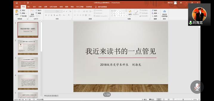 接着,2018级历史学专业刘海龙以《英国工人阶级的形成》一书分享了假期读书的心得。从这本书中,他感悟到研读理论是批判继承理论的前提,学习历史需要以历史的观念,重回历史现场,重新发现被宏大叙事、宏大概念忽略的人。作为补充,他还分享了《想象的共同体》、《民族与民族主义》和《英国工人阶级的形成》三本书的构成脉络。在最后,他指出历史学专业的学习要紧跟老师节奏,多和同学交流,才能碰撞出思想的火花。