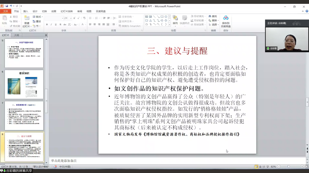 本次讲座以“知识产权保护漫谈”为主题。谷彩霞庭长以民法典等时事热点为切入点,结合习近平总书记在《求是》上发表的文章,为大家介绍知识产权保护的重要性及重大意义。她深入浅出地向大家介绍了知识产权保护的基本知识,结合现实生活中的例子,纠正了大众对知识产权保护的错误认知。她联系近年热点事件,例古籍《镜花缘》点校成果是否受保护等多类型的典型案例向大家进一步讲解了著作权知识的保护。她强调,我国通过民事、行政、刑事三管齐下,对知识产权进行立体的、全面的保护。她指出,高校员工未来无论是在实习还是工作岗位上,都将会与知识产权保护息息相关,要具有法律意识,要及时对自己创作的作品进行登记,使用他人作品要谨防被诉侵权的风险,及时进行商标注册,申请注册商标要有显著性和独创性,明确约定合作研发或创作成果的权利归属等。在最后一部分,同学们进行了积极踊跃的提问,谷彩霞对相关问题进行了深入的解答和交流,大家受益匪浅