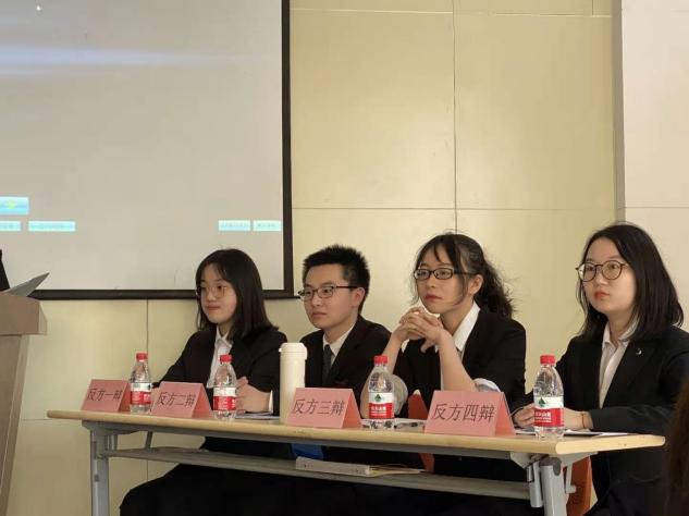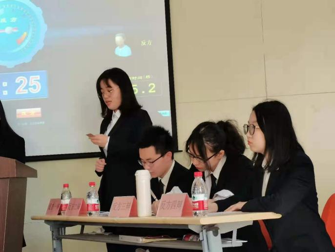 上午10时30分,比赛正式开始。在开篇立论环节,正方一辩赵婧羽开宗明义,深入浅出地阐发了体育明星偶像化现象有利于发展竞技体育、促进全民健身、传播体育精神的观点,后针对反方四辩关于“商业包装与国家包装”、“价值选取对象”等质疑点予以回击。四辩董欣怡质询反方一辩时思路清晰,一针见血。二辩陶新宇以强有力的数据支撑阐述了偶像对青少年的引导作用,强调偶像化并不是洪水猛兽。三辩李紫琪以逻辑缜密、言语犀利的质询赢得全场掌声,将现场气氛推向高潮。