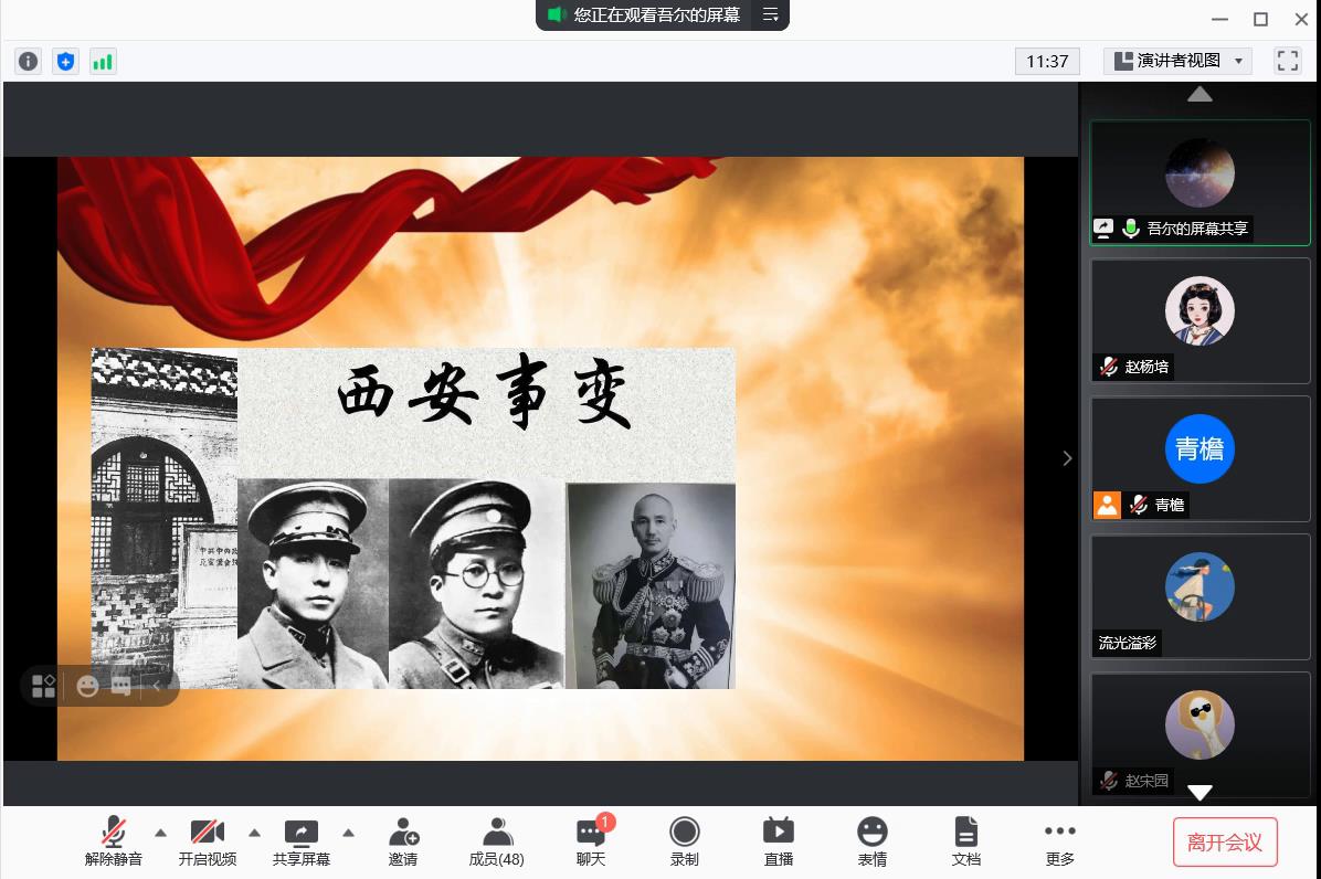为庆祝中国共产党成立100周年并落实党史学习教育,5月13日晚,历史文化公司硕士第一党支部举行“学党史、悟思想”线上微党课专题活动。党支部成员以及部分积极分子参加此次会议,三位同学分别进行了微党课讲授。