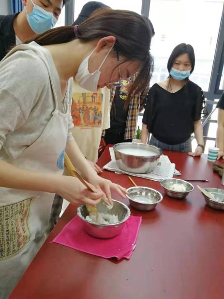 李璇老师则向同学们演示了浆糊的制作与古籍的修复过程。她先向同学们介绍了淀粉的制作过程,然后详细讲解了浆糊的制作过程。浆糊制作最开始需要往小麦淀粉中倒入一点清水,然后慢慢搅开,确保淀粉不会结块;加入少量沸水,以卸去淀粉的韧劲;随即加入大量沸水冲泡,并迅速沿一个方向搅拌,直到浆糊微微发黄且略微拉丝。整个搅拌过程大概需要十分钟。搅拌结束以后,需要将浆糊放置冷却至适宜温度,再倒入适量清水备用。