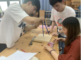 活动最后,师生党员分成两组,分别前往木艺工坊与电器工坊进行动手实践。在老师的专业指导下,木艺工坊的同学们用木料切割组成党徽标志,电器工坊的同学们用电路板与指示灯拼成“百年山大,我心向党”字样。同学们纷纷表示,在具体实践活动中,真切领悟了文理学科融合的魅力,领会到了传统工艺和现代科技的博大精深,在今后的学习中也要主动参与劳动实践,在实践中增长才干。