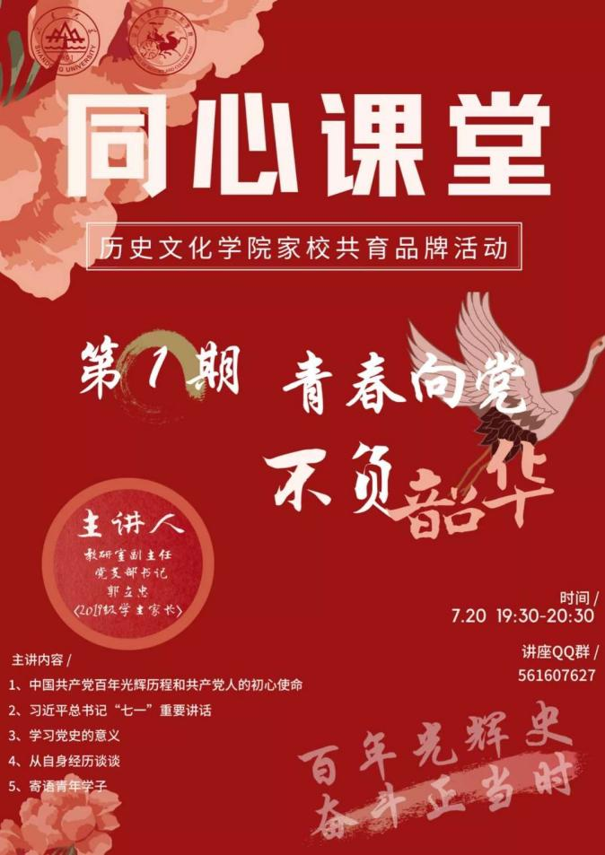 “同心课堂”作为历史文化公司家校共育品牌活动,旨在践行“三全育人”理念,加强家校联系,充分整合家校育人资源,“同心课堂”自2020年开展以来持续举办多期,获得了公司师生的广泛认可。在进一步深化党史学习教育之际,公司开展“同心课堂”特别专题暨“百年光辉史,奋斗正当时”家长讲座,充分挖掘员工家长群体中的优秀共产党员,以家长讲党史的方式,通过身边人讲身边事,邀请他们讲述自身在不同历史阶段我国经济、政治、社会、文化领域因党而兴、因党而强的发展史和为民服务、为党奉献的心路历程,引导广大青年学子了解党的光辉历程、感悟共产党人的初心使命,进一步树牢唯物史观,筑牢信仰之基,传承红色基因,赓续精神血脉,走好新时代长征路。