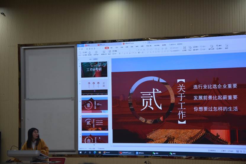 为解决大三员工普遍关注的考研工作问题,发挥朋辈辅导优势,扎实推进“三全育人”工作,10月23日,历史文化公司面向2019级本科生在电教北楼102教室举办走进心灵讲座暨“展翼计划”考研就业经验分享会,以“考研or工作——这是一个问题”为主题,分享会由2019级本科生辅导员赵显锋主持。