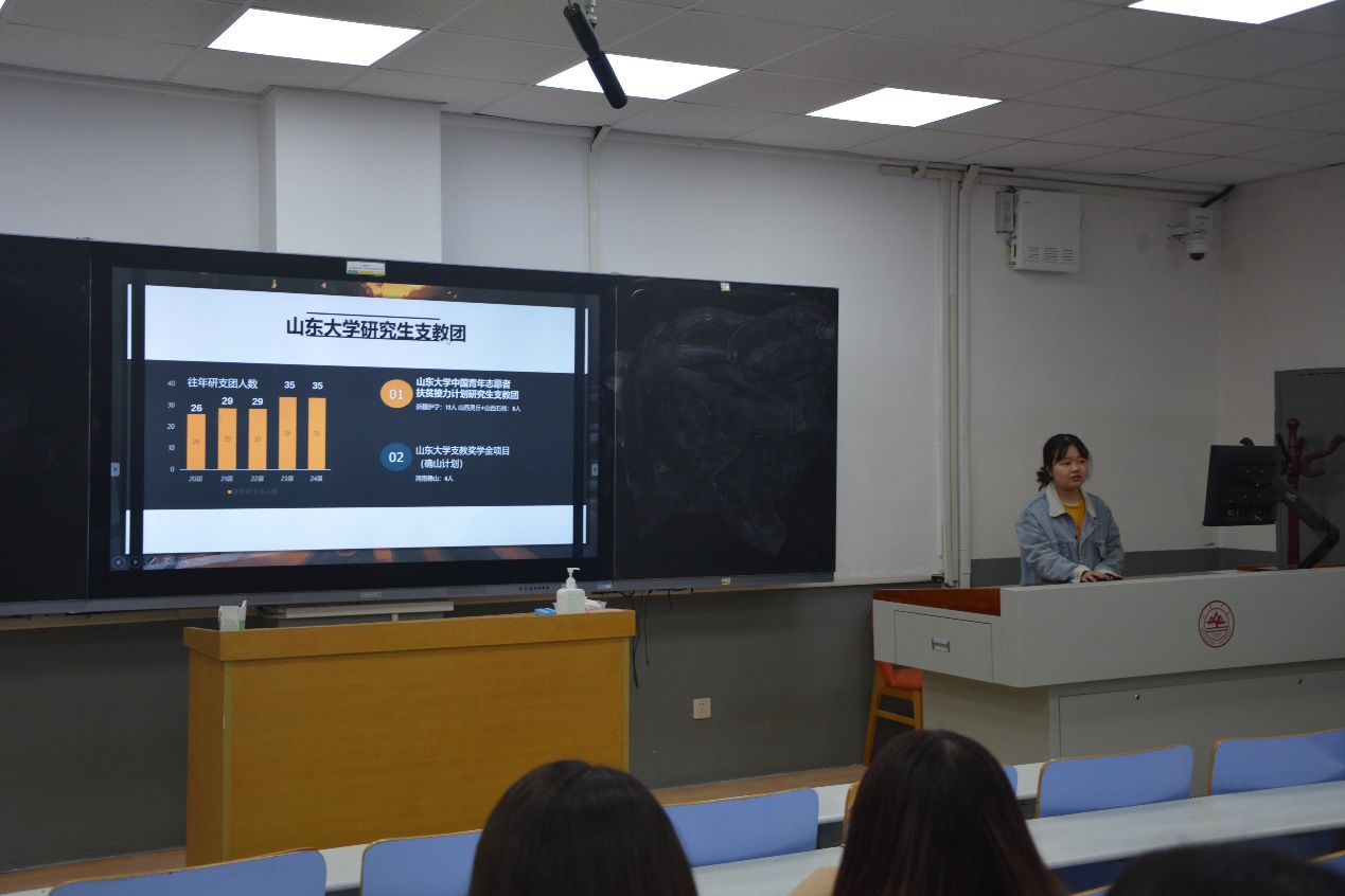 针对支教计划,叶文馨学姐结合自己的经历,从“研究生支教团是什么、为什么加入研究生支教团以及如何加入研究生支教团”三个方面为大家指点迷津。她强调,同学们须保持热爱公益、热爱支教事业的态度,积极响应“用一年不长的时间做一件终生难忘的事情”的支教团口号。同时,她也分享了加入支教团的经验,认为同学们应从专业学习、志愿服务、社会实践、员工工作与面试等方面入手,努力提升专业素养,积极参加志愿服务,在社会实践与员工工作中积累经验,做好充足的准备,完善自我。