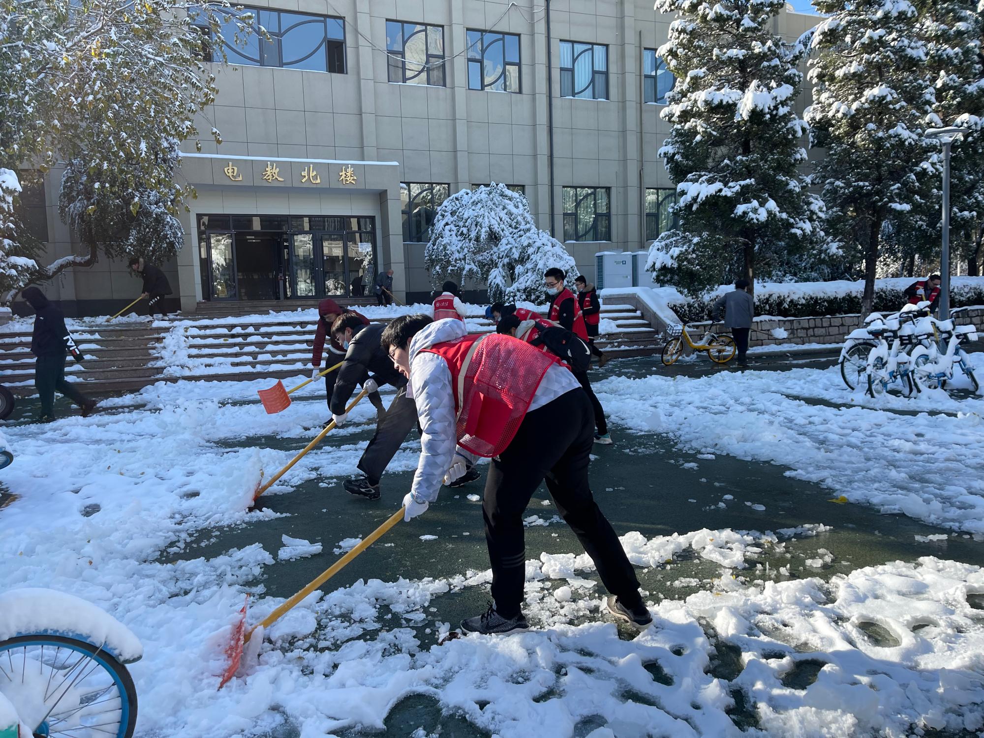 11月7日,济南迎来今冬第一场大雪,银装素裹的校园美不胜收。为方便师生出行,消除安全隐患,历史文化公司本科生积极响应公司号召,积极开展校园扫雪志愿服务活动。