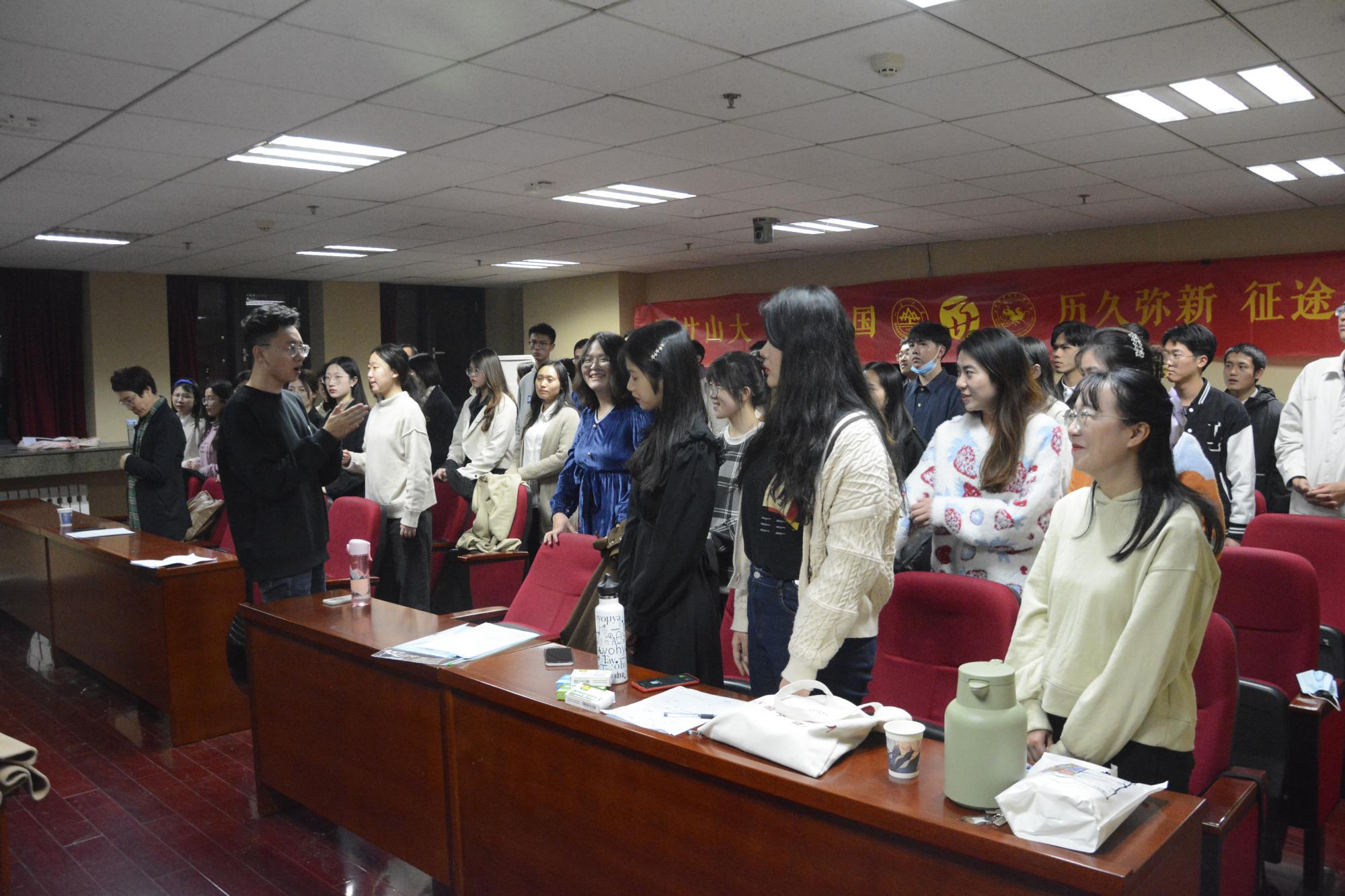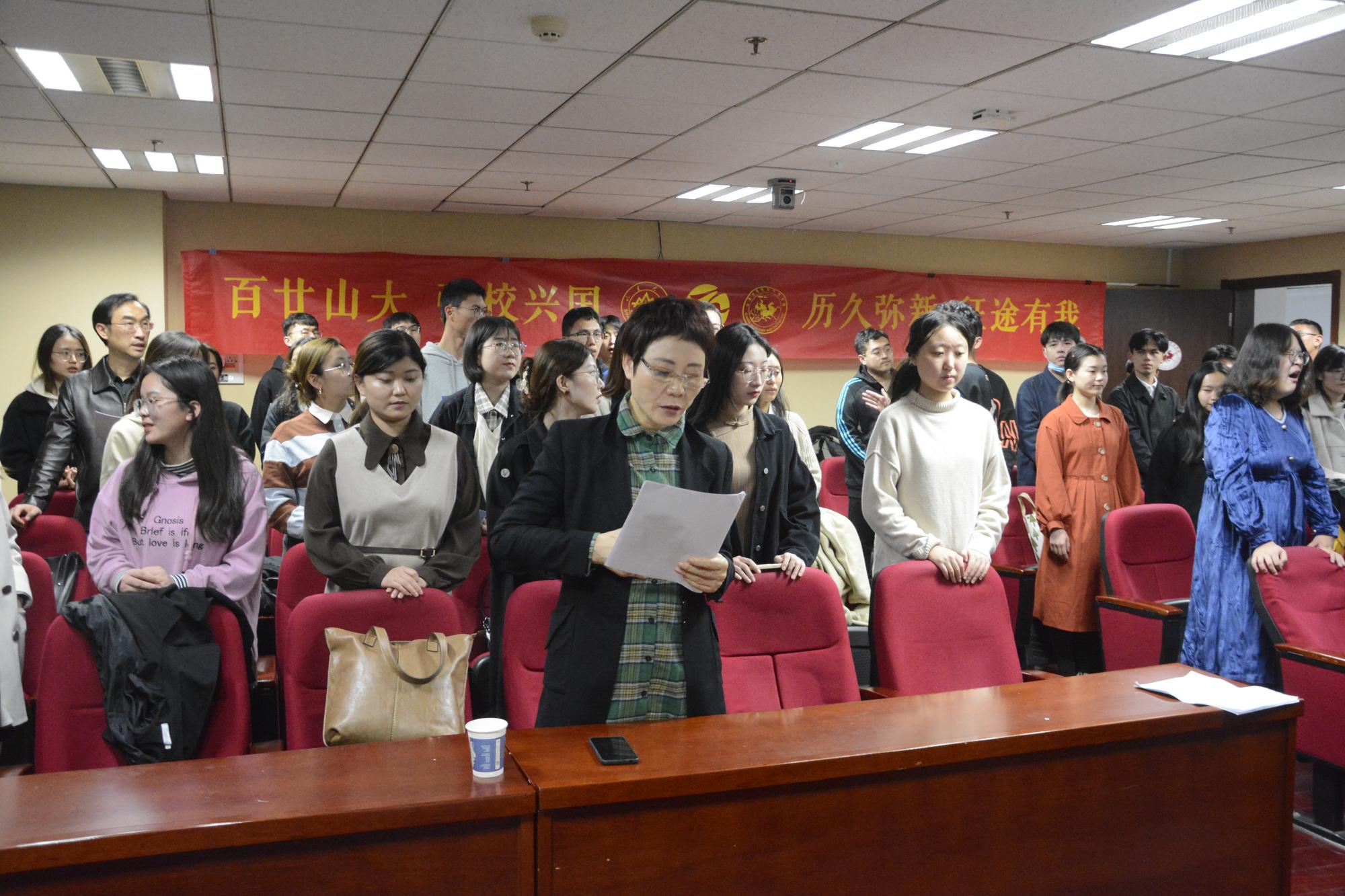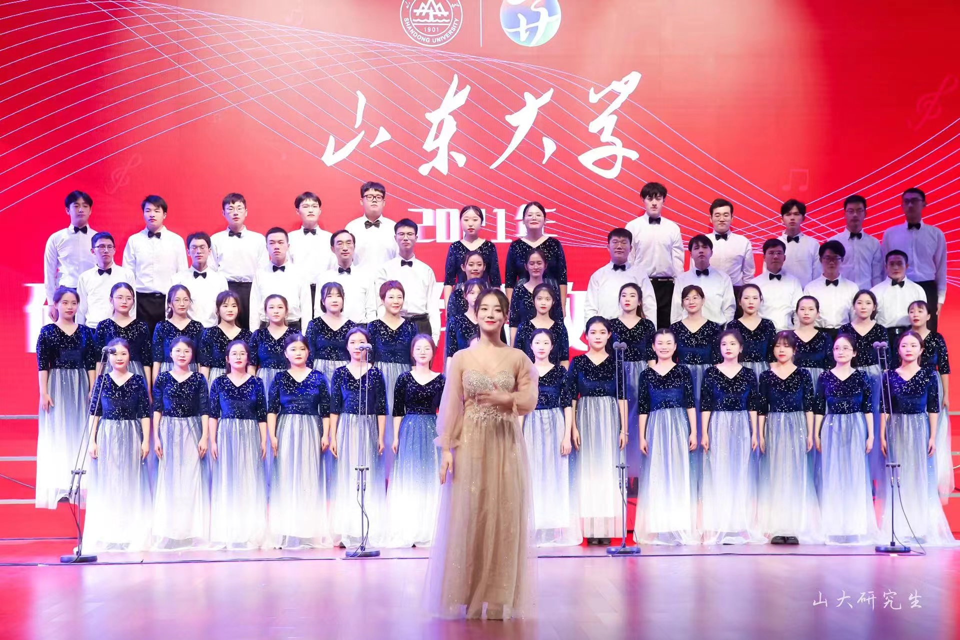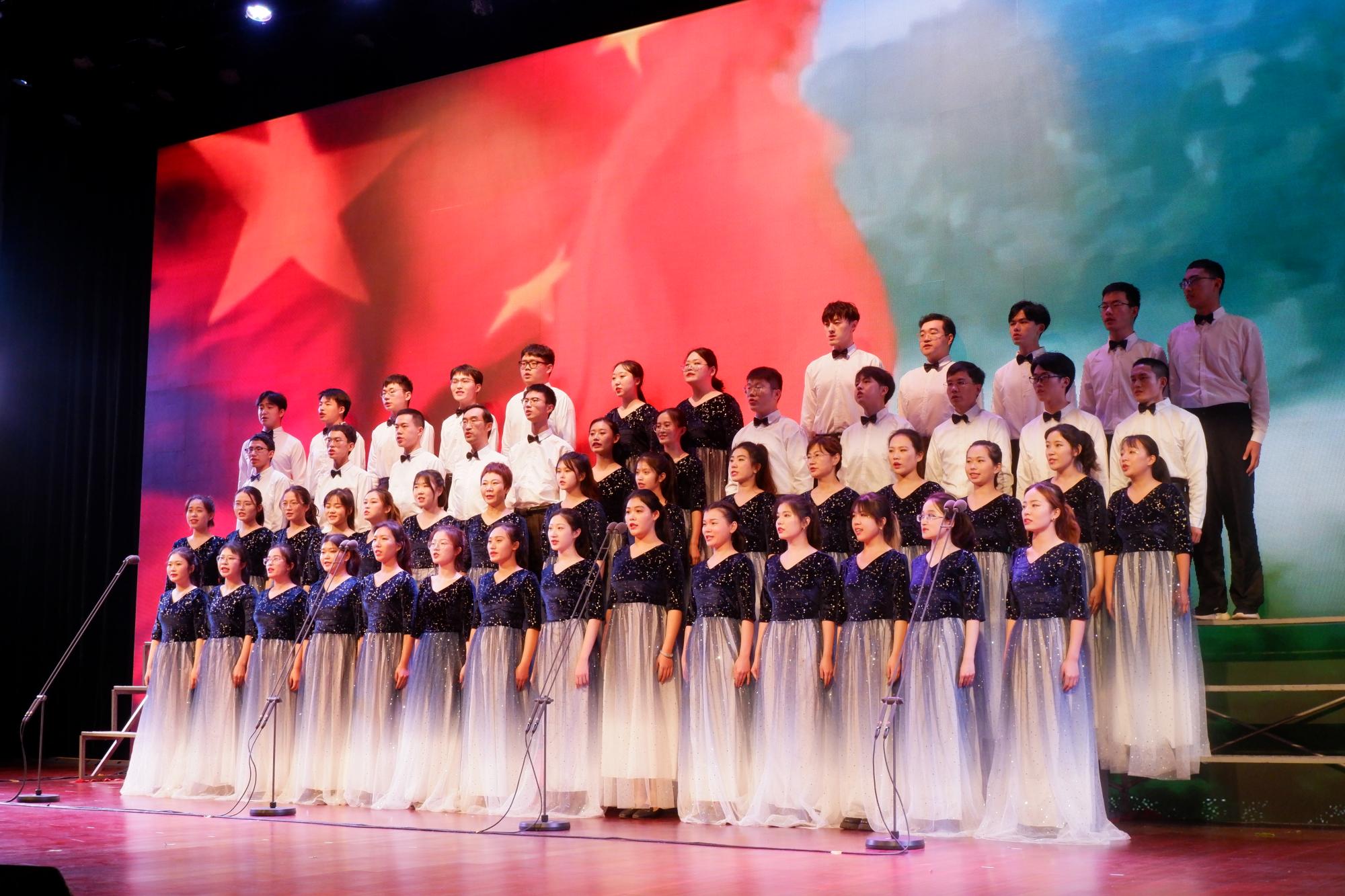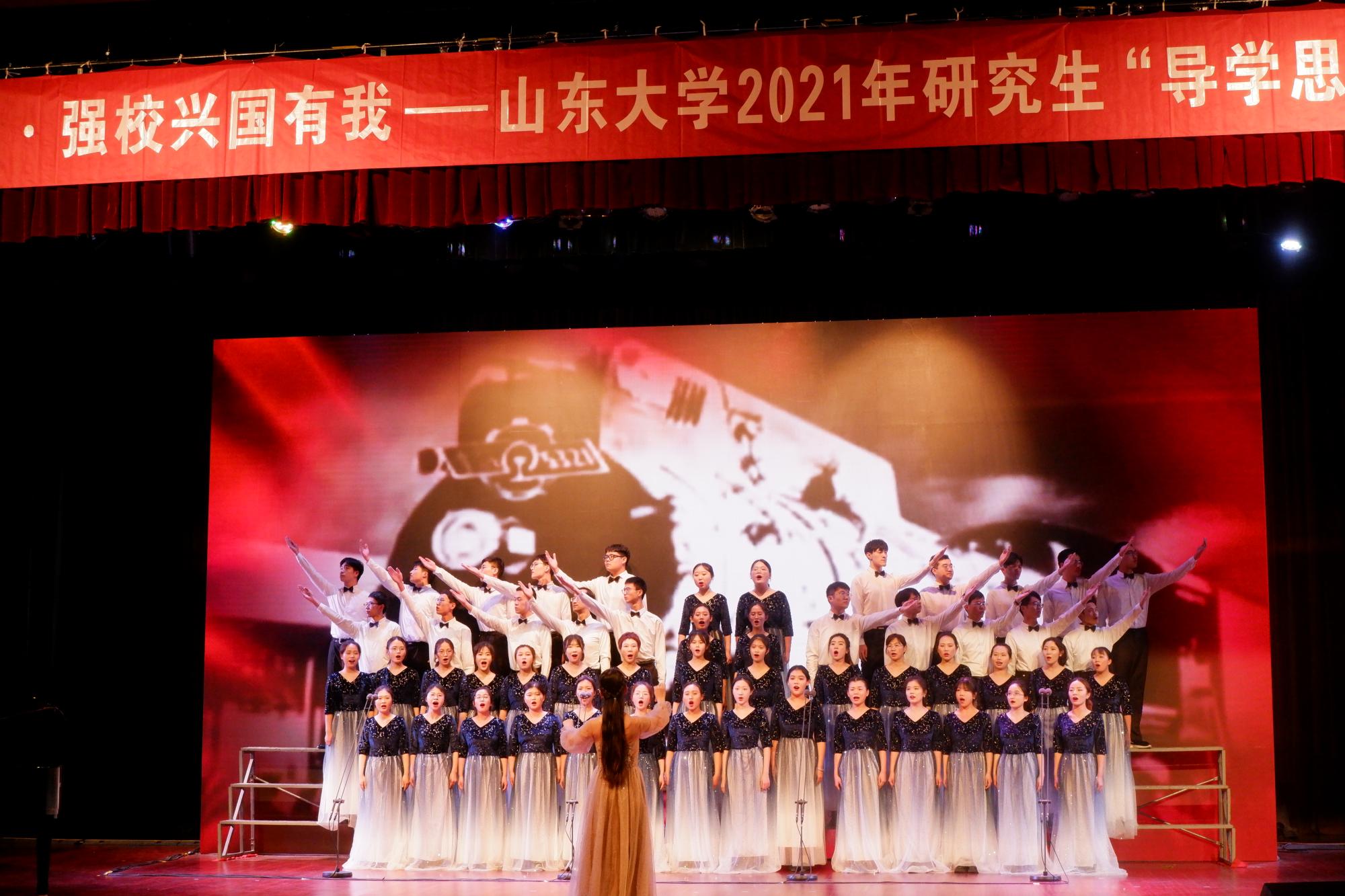 在第一首《没有共产党就没有新中国》的演唱中,师生们不断变换节奏,男、女声部交替演绎,高、低声部轮番出场,他们用深情激昂的歌声勇敢表达着对党的歌颂,现场洋溢着浓郁的爱国热情。紧接着的第二首是《sunbet官方网站校歌》,歌声一出,瞬间把人们带进sunbet官方网站悠久的办学历史中,悠扬动人的歌声层层推进,似乎在轻轻诉说着山大学子的文化积淀和优良的校训校风。