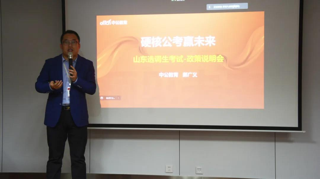 在首场讲座中,中公教育郝广义老师从选调政策串讲、考试备考说明以及个性答疑解惑三个部分展开讲解。在选点政策板块,郝广义从选调生和公务员两场考试的对比分析入手,介绍了公务员考试的整体形势、考试时间及相关内容、招考比例等,并对如何选岗提出系列建议。在考试备考说明板块,分析了笔试试卷的结构,针对行测、申论等重要部分作出详细讲解并提出相关备考建议。同时,他强调了坚强的心理素质和良好的表达能力在面试过程中的重要性。在答疑阶段,郝广义与在场员工展开积极互动交流,并为大家分享了备考阅读书目和材料,鼓励同学们不畏艰险、认真备考。