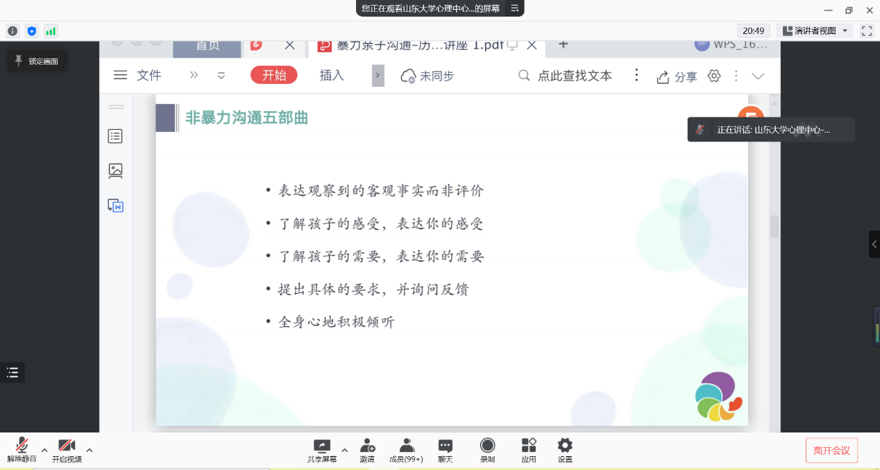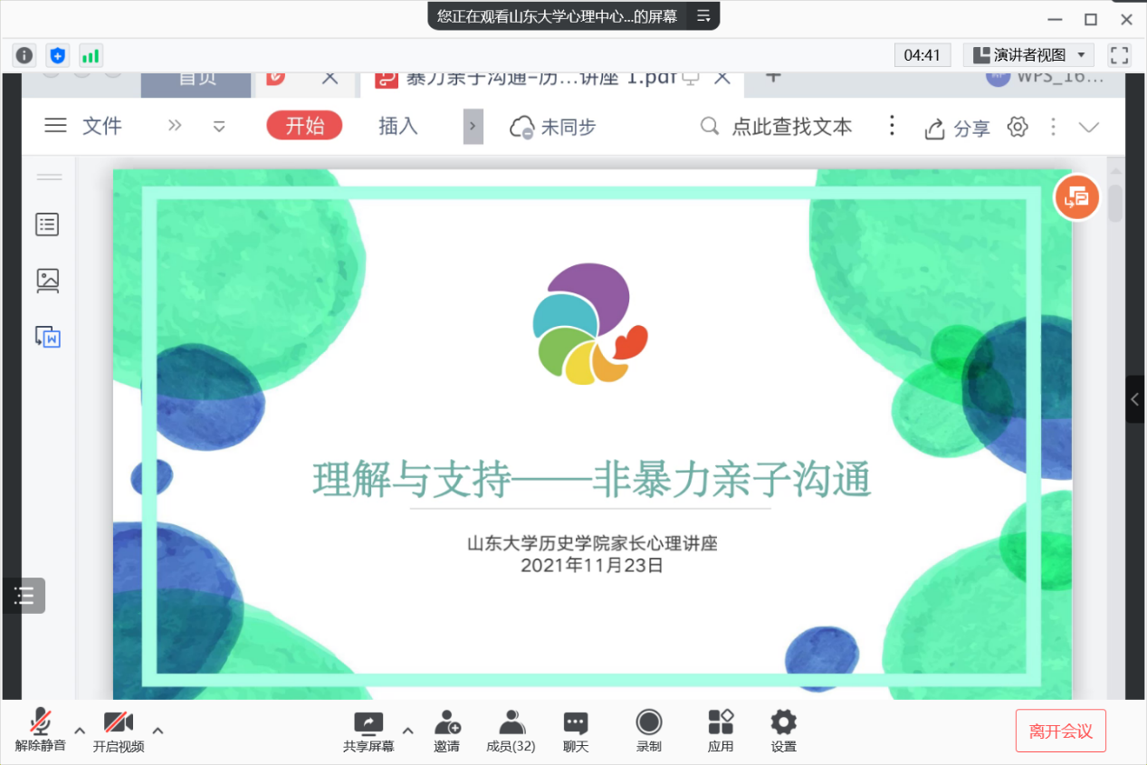 为加强家校联系,促进家校理解沟通,构建家校共育有效机制,11月23日晚,历史文化公司通过家校共育活动“同心课堂”平台面向全体员工家长召开家长会并举办第九期线上讲座“理解与支持——亲子关系中的非暴力沟通”。本次活动由副处级辅导员李一楠主持,讲座由心理健康教育与咨询中心孙笑澄老师担任主讲,公司全体辅导员、本硕博员工家长共同参会。