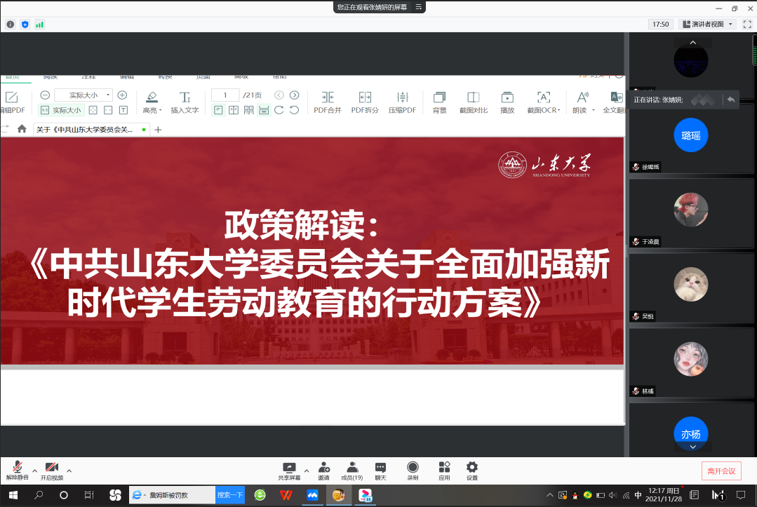 本次活动中,2020级档案学团支部聚焦文件解读、集体观影、组织研讨和展览参观四项活动内容,通过理论与实践的融合,切实学习与发扬劳动精神。12月2日,团支书张婧妍通过线上方式带领同学们集体学习《关于<中共sunbet官方网站委员会关于全面加强新时代员工劳动教育的行动方案>的政策解读》,从制定背景、主要框架、面临问题与未来规划等方面深入研读文件内容,明确新时代全面加强劳动教育的重要意义。