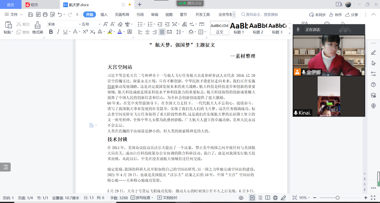 队员金伊娜在会议上分享了她的前期工作。她的支教对象是正在读初三的邻家妹妹刘洁。该生成绩中等偏上,目标冲刺县里最好的中学,学习紧,任务重,压力大。假期的第一个目标是参加公司组织的征文比赛。在沟通过程中了解到,该生想完成一篇航天主题的议论文,目前在文章主题定位、框架构建、议论语言表达等方面存在困难。因此,队员金伊娜首先带她梳理了中国航天发展史,然后引导该生确定了文章主题、论点与分论点,搭建文章框架。通过‘学习强国’平台,与该生一起学习习近平总书记等国家领导人与航天相关的讲话精神,浏览相关新闻素材,学习简练的议论语言,进而清晰文章脉络、填充文章内容。在支教过程中,金伊娜还分享了很多学习心得和体会,以及在初三中考冲刺阶段稳定心态、调整状态的技巧和方法。