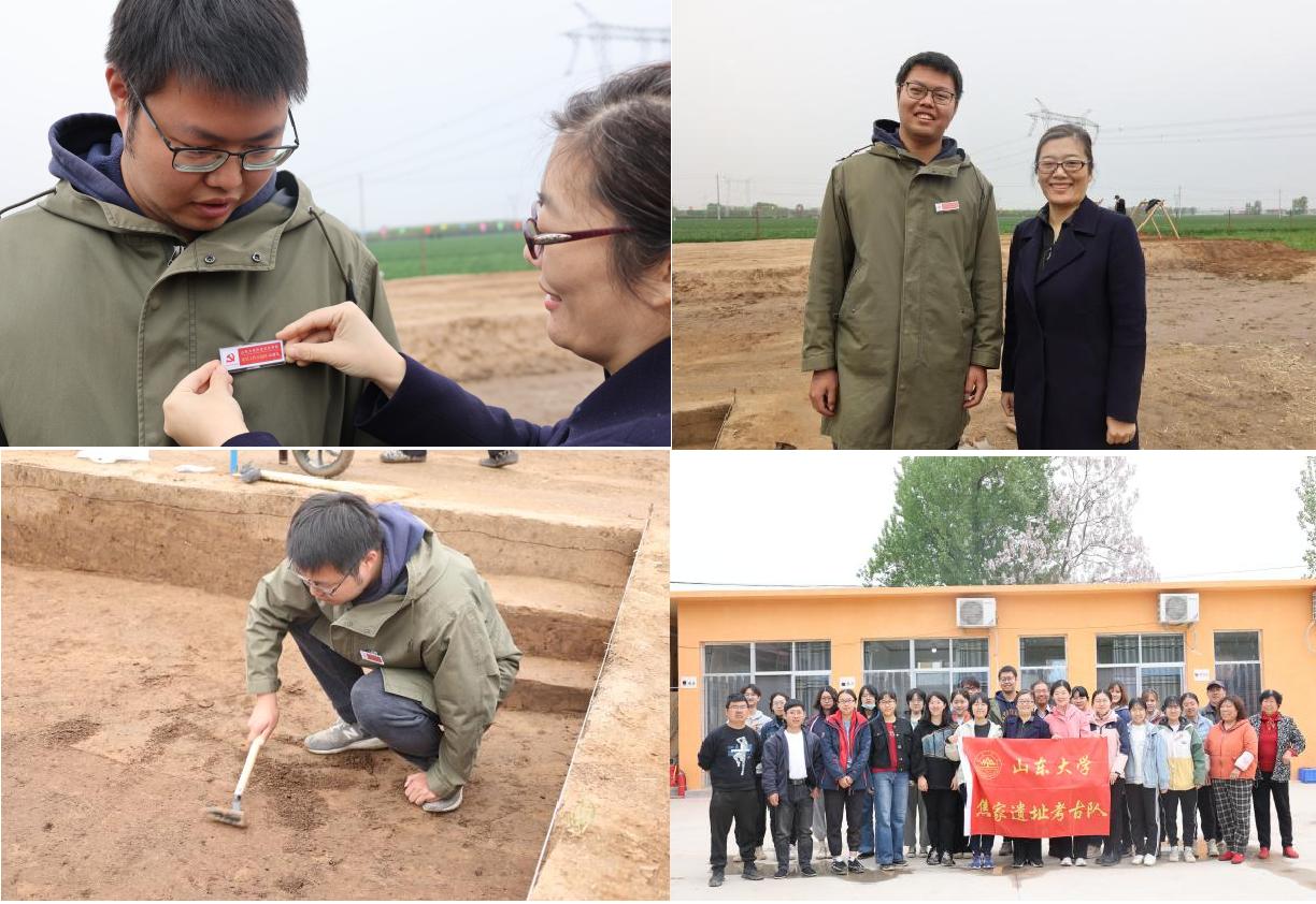 校外授牌仪式在章丘焦家考古工地开展,王芬、李一楠向在焦家工地进行考古实习的支部党员宋浦文授予“党员工作示范岗”的称号,勉励他扎根田野实际,在发掘实践中发挥党员的模范带领作用,让党旗在考古发掘一线高高飘扬。