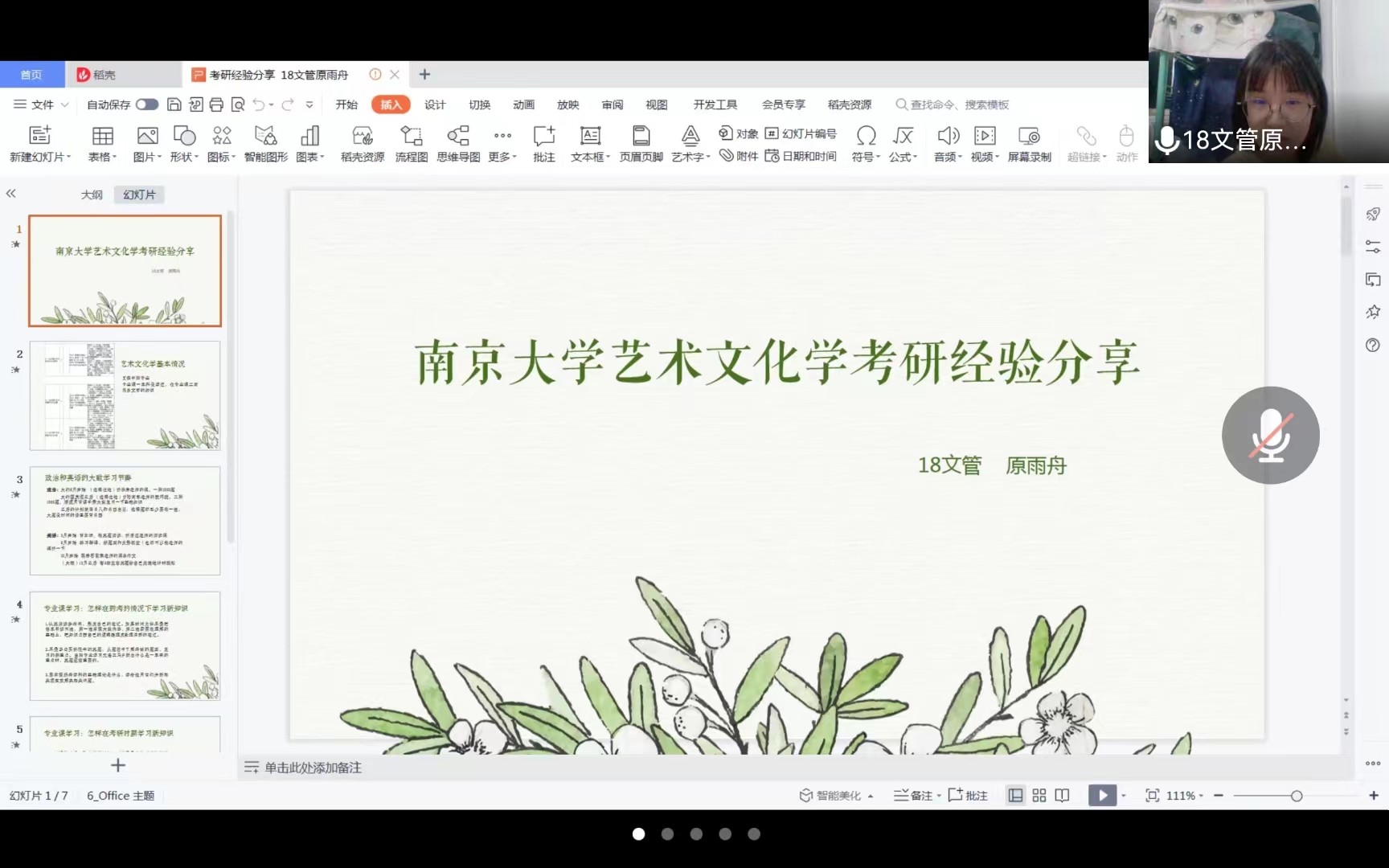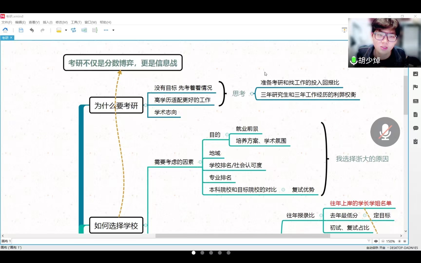 已被中国传媒大学录取的张浩轩在心态调整、信息收集方面分享了宝贵建议,并以自己的经历为例详细讲解了中传材料评议环节和复试环节的细节和注意事项,特意指出要同时关注就业信息,建立考研为主、就业为辅的心态保障机制。被武汉大学录取的张靖煜则以自己择校、择专业时随机应变的经历出发,强调考研中选择的重要性,学会依时依势灵活变通,同时在如何增加考研动力问题上展示了自己的有效做法。被南京大学录取的原雨舟从艺术文化学专业情况、公共课学习节奏、专业课学习方法、心态调整四方面分享了跨考心得,她指出,要在专业课学习要稳扎稳打,学习用所学专业的基础理论分析解决问题,注重逻辑梳理、语言组织的基础能力培养,重视学有所得而非学仅为考的过程。被浙江大学录取的胡少焯通过思维导图的方式全面清晰地为大家梳理了从选择到准备的考研过程,详细列数了不同阶段的注意事项,并向同学们推荐了学习软件和考研信息获取方式,用生动形象的语言总结了跨考的技巧和教训,帮助同学们清晰考研规划。