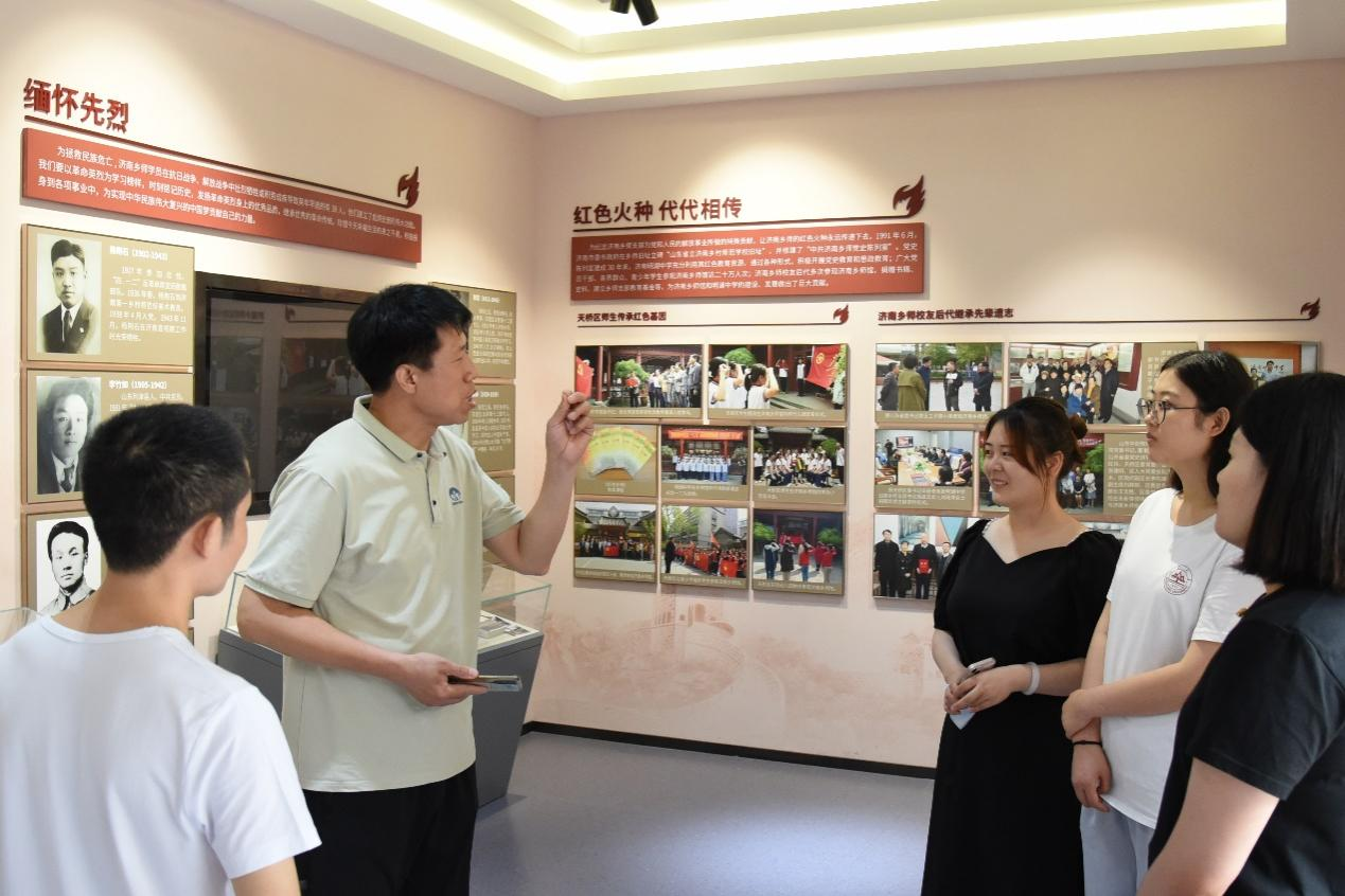 在中共济南乡师历史陈列室,陈列室负责人丁士彬老师满怀激情地向团队成员讲述了中共济南乡师支部1929年至1938年期间可歌可泣的党组织发展历史。