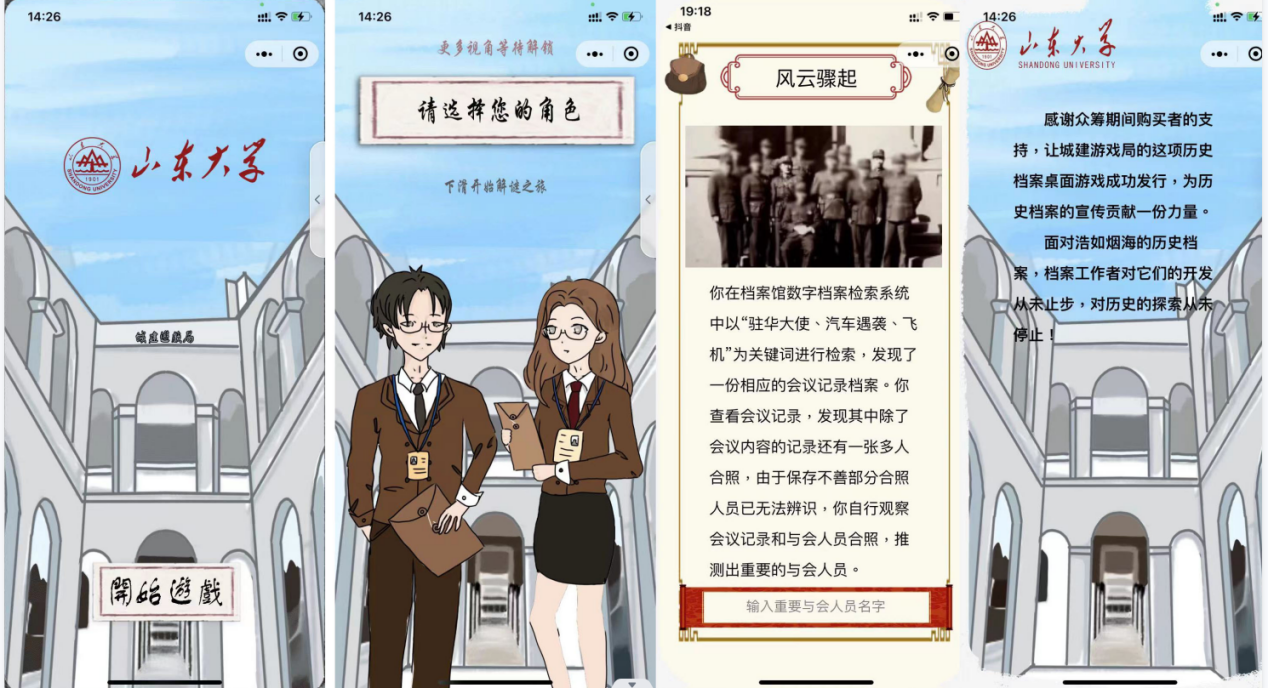 sunbet官方网站历史文化公司“解谜”档案文化资源——众筹游戏开发团队针对档案文化资源受到忽视、人们档案意识较差的社会现状,团队创新商业模式,利用众筹解决资金问题,并且深入探索尘封的档案,进行二次创作,以线下线上相结合的解谜游戏呈现历史故事,传播档案文化。团队完成了档案的收集、故事的创作、小程序前期设计和众筹模式的对接小程序研发测试等工作。