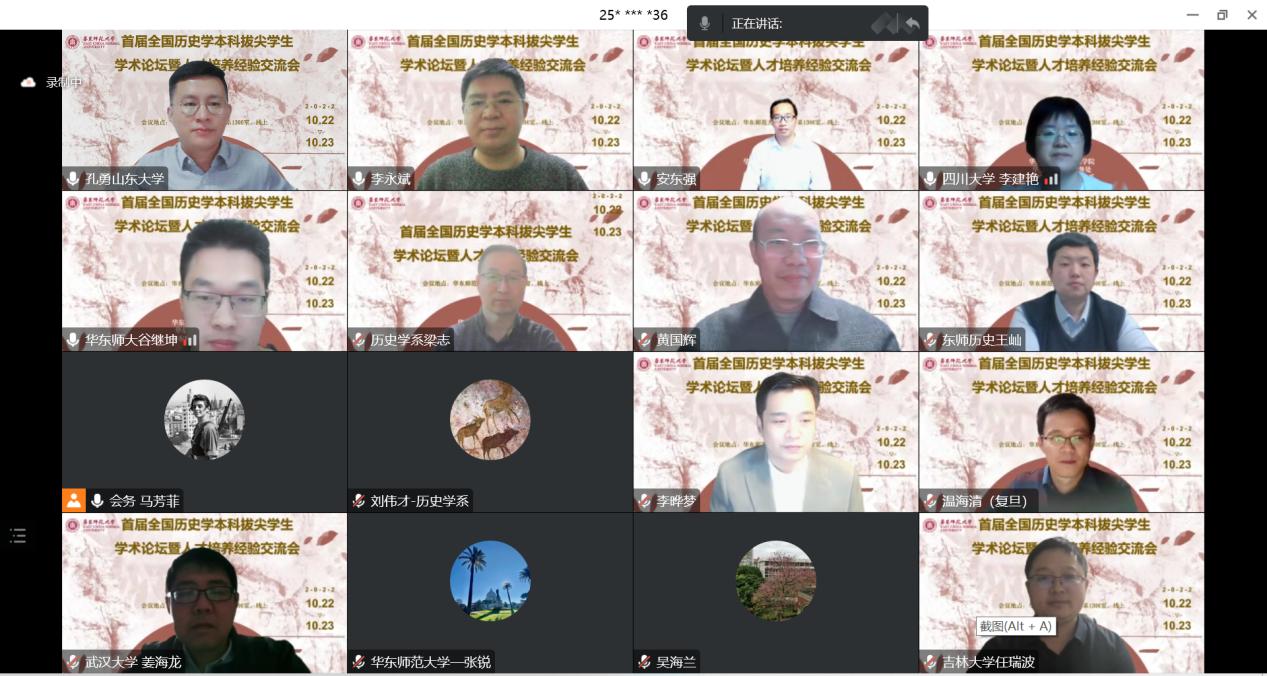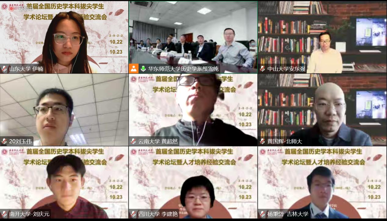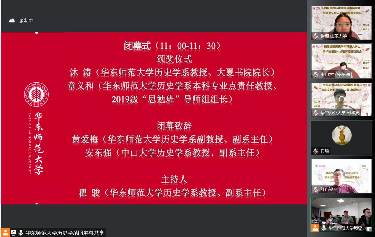 为推动拔尖计划2.0基地建设,加强兄弟院系间相互交流与学习,促进历史学本科拔尖人才成长发展,2022年10月22日至23日,华东师范大学主办首届“全国历史学本科拔尖员工学术论坛暨人才培养经验交流会”。历史文化公司孔勇老师与2019级本科生伊楠、2020级本科生王若蘅线上参会。