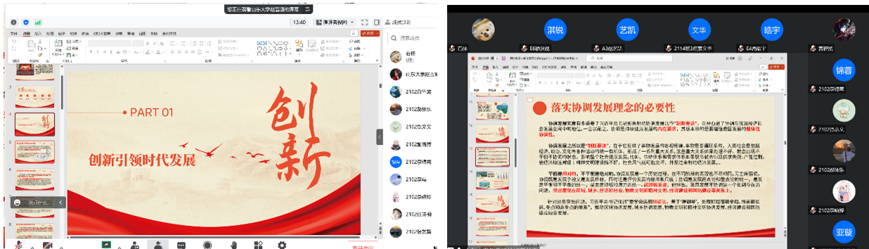 赵雪涵讲解道“创新发展居于国家发展全局的核心位置”,并结合当今国际背景以及我国坚持自主创新而获得的科技成果,指出只有重视创新才能促进国家长治久安、民族永续发展;从哲学辩证法的角度介绍了协调发展的必要性 、“协调促进平衡发展”的正确性;结合视频和塞罕坝人民的艰辛努力叙述了绿色发展推动和谐共生;指出我国目前在共享发展方面仍存在的不足和落实共享发展理念的必要性,并且着重强调了教育公平及共同富裕;最后从“国内区域发展”和“国际贸易发展”两方面阐述落实开放发展理念的必要性。