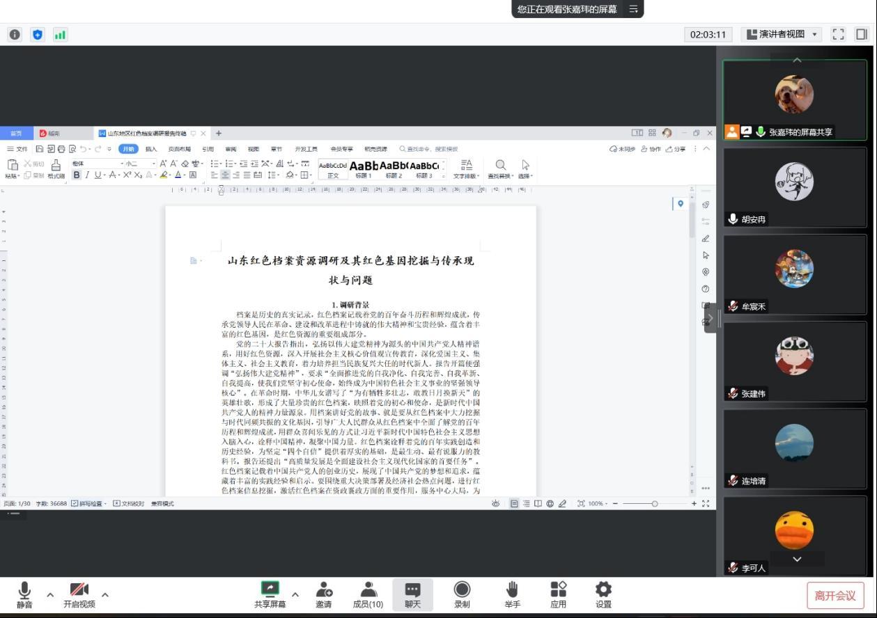 经过团队成员与档案馆工作人员积极地沟通交流,我队获得了省内各地市红色基因挖掘情况的部分数据,对于红色基因的传承现状有了进一步的了解。通过对所得数据、典型案例及工作现状进行分析,我们明晰了目前工作中遇到的困难、存在的问题及未来红色档案工作发展的方向,经多次讨论并最终形成了题为《山东红色档案资源调研及其红色基因挖掘与传承现状与问题》长达三万六千余字的调研报告。