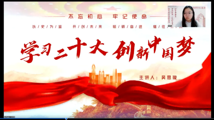 为深入学习宣传贯彻党的二十大精神,2023年1月19日晚,sunbet官方网站小树林鹰翔支教队队员吴思璇同学走进河南平顶山苗楼小学,以线上形式向同学们开展了主题为“学习二十大,创新中国梦”的党的二十大精神宣讲活动。新时代赋予少年儿童更优越的成长环境,新征程呼唤担当民族复兴大任的时代新人,当代青少年将成为社会主义现代化强国建设的生力军,深刻理解党的二十大精神对当代青少年健康成长具有重要意义。
