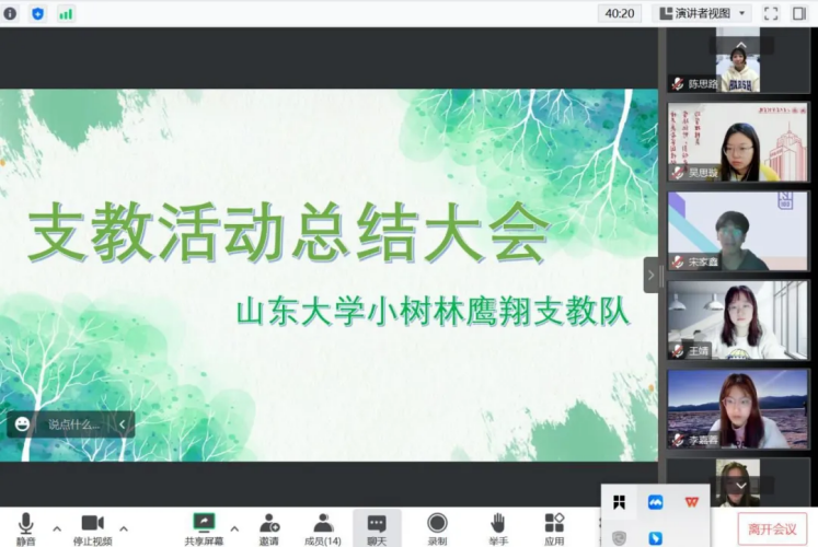鹰翔支教队于2023年1月20日晚召开总结大会,队长首先对大家的辛勤付出表示了肯定与表扬,随后对后续工作进行了统筹与安排,为此次线上支教活动画上圆满的句号。