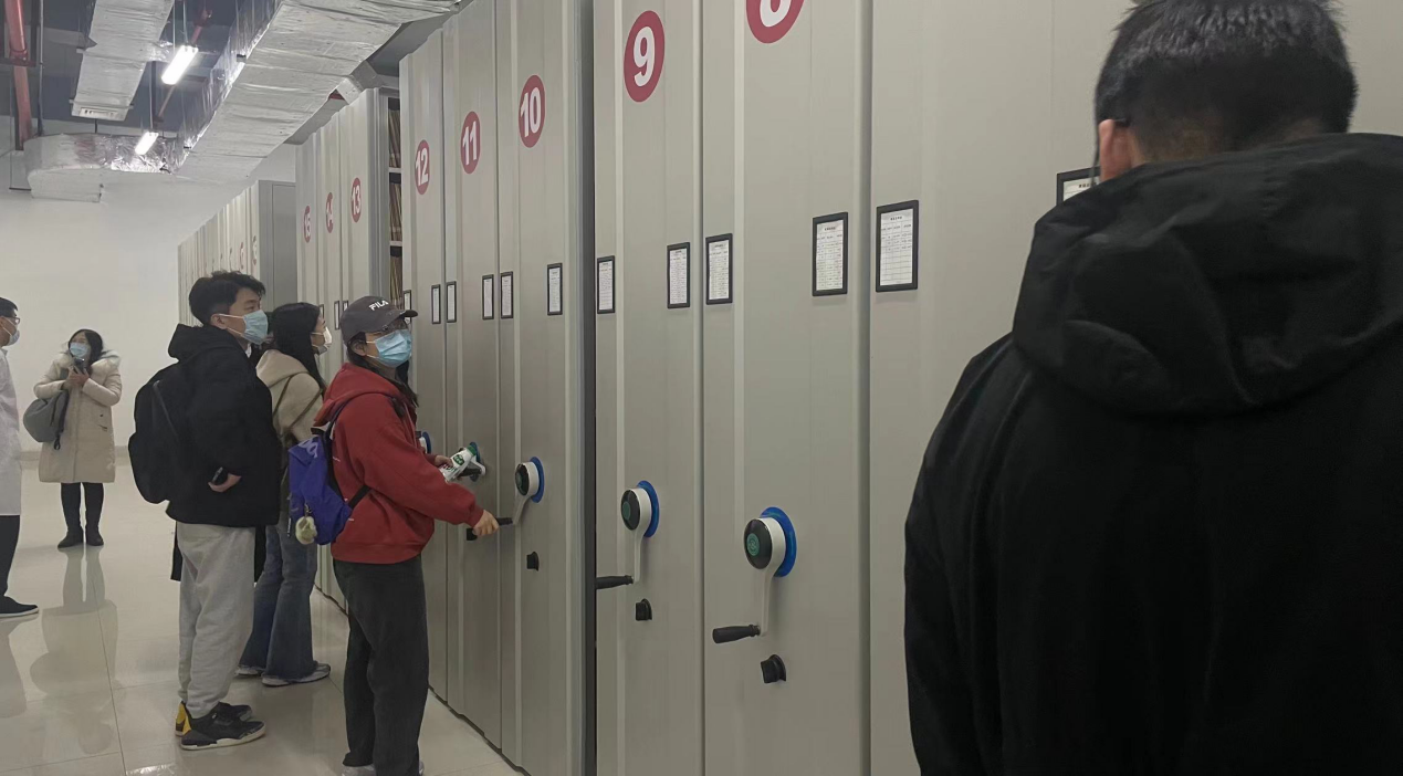 随后,按照原定参观访问计划,由负责人带领,我们一同参观了档案库房。库房管理人员就近年来库房内新增的视频监控设备,智能湿度温度感应调节设备,档案安全存放与保管的新型技术手段向大家进行了详细的介绍。在此期间,同学们体验了密集架的操作和档案盒的存取,并表示“书本上的知识和实际的操作存在很大的差距,如果想学到真本事,做出真学问,不得不来到档案工作的第一线,从一件件档案管理的小事做起,解决重复繁琐的问题,才能足以磨练性格,增长才干,实干永远大于空谈。”