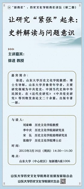 3月16日下午,“新青年:历史文化公司青年讲坛”第二期报告会举行。中国近现代史教研室徐进教授担任主讲嘉宾,讲题为“让研究‘紧张’起来:史料解读与问题意识”。刘家峰教授担任点评人,李中庆、宋弘、张晓宇等青年教师参与讨论。报告会由武绍卫副教授主持,采取线上线下相结合形式,吸引了校内外百余名师生参加。