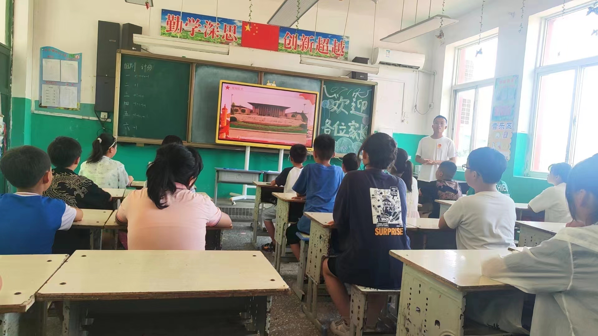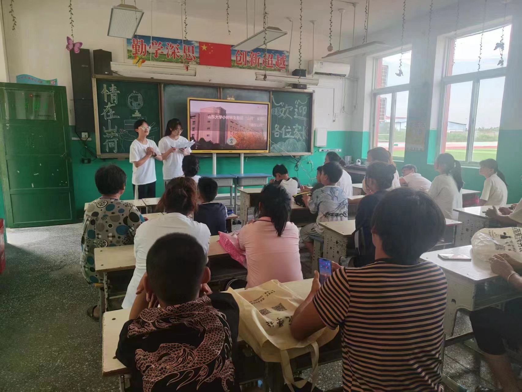 7月14日上午8点半,sunbet官方网站小树林支教团“山荷”支教队大屯分队在山东菏泽市东明县大屯镇中心小学开展“小荷学堂”开营仪式暨家长见面会,在本次开营仪式中,“山荷”支教队大屯分队的6名同学分别作了自我介绍,之后队长苏立朋向家长们介绍了本次“小荷学堂”开展的主要课程,强调了课堂的纪律以及接送时间等内容,并积极回复了家长们提出的各种疑问。最后,开营仪式在9点左右结束,“小荷学堂”第一天的课堂正式开始。