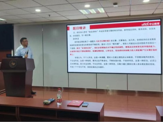 郝广义首先点出了2024年度山东选调出现的重大变化,之后从新政梳理、备考策略、真题题型三个方面介绍了山东省选调的招考要求、待遇发展以及笔试面试考情。通过考情回顾并结合选调题型分布,郝广义提醒同学们要重点关注考前半年的时政,多做题以熟悉出题套路,多看新闻知识来扩充知识面,并建议在报考时以定向为首,优选家乡,充分利用自身学历优势。接着郝广义以近期发布选调公告的其他省份为例,就笔面试异同点做横向比较分析,另外结合报考情况,分析不同地区不同岗位的报考难度,提供选岗建议。在如何备考方面,郝广义从公共基础知识和写作两部分出发,通过讲解真题向同学们展示了其主要包含的时事政治、政治理论、法律基础等各类题型,强调了在写作中以“立意为先”并具体示范了如何进行论证优化。同学们积极参与答题互动,现场氛围欢快活跃。