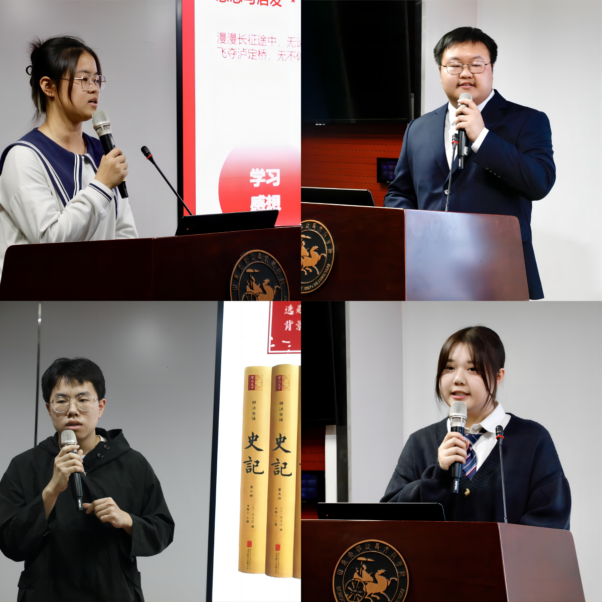 经过初赛,8位主讲人进入线下评选。各主讲人以习近平新时代中国特色社会主义思想为指导,立足新时代青年自信自强,吃苦奋斗,团结一心,开放包容的使命担当,用青年喜闻乐见的方式、语言,讲述如何在学思践悟中坚定理想信念,在奋发有为中践行初心使命。徐灿以“结缘与山大,志愿共前行”为题,讲述自己在志愿服务中的体会与感悟;张皓诚以“盛世脚步,青春闪耀”为题,论述了自己眼中青年与国家的血脉联系;严浩以“新时代十年神州展新颜·跬步江山青年启征程”为题,讲述家乡阿坝的十年巨变,表达新时代青年的使命担当;姜睿聚焦公司各专业,以“共飨文明之光,厚植文化自信”为主题,表达了对未来的信心与期许;费俊凯的演说将“发扬实事求是精神”与“坚持文化强国道路”相联系,用生动的小故事展现实事求是的实践伟力;樊华以“忆‘档’年——回望历史,铸就未来”为题,以品读红色档案为切入,回望中国共产党百年奋进历程;李梓杰则切中“新时代全面依法治国的实现方式”,讲述党在治国理政上的方略和成就;谭奕凯以“历史之韵——我与历史的交响”为题,将自身经历与学科背景结合,表达对考古专业的理解与认识。