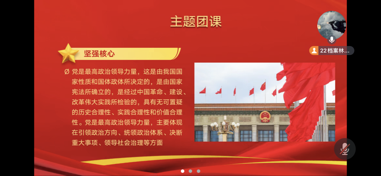 坚强领导核心,凝聚青春力量。10月12日晚,2022级档案学团支部开展“不忘初心、牢记使命”线上主题团课。团支部书记林心宇讲述中国共产党百年来作为党的领导核心,带领中国人民和中华民族实现从站起来、富起来到强起来的伟大飞跃,中国共产党是经过中国革命、建设、改革伟大实践所检验的,通过团课,让同学们坚定党的领导,凝聚青春力量,朝着实现中华民族伟大复兴的目标阔步前进。