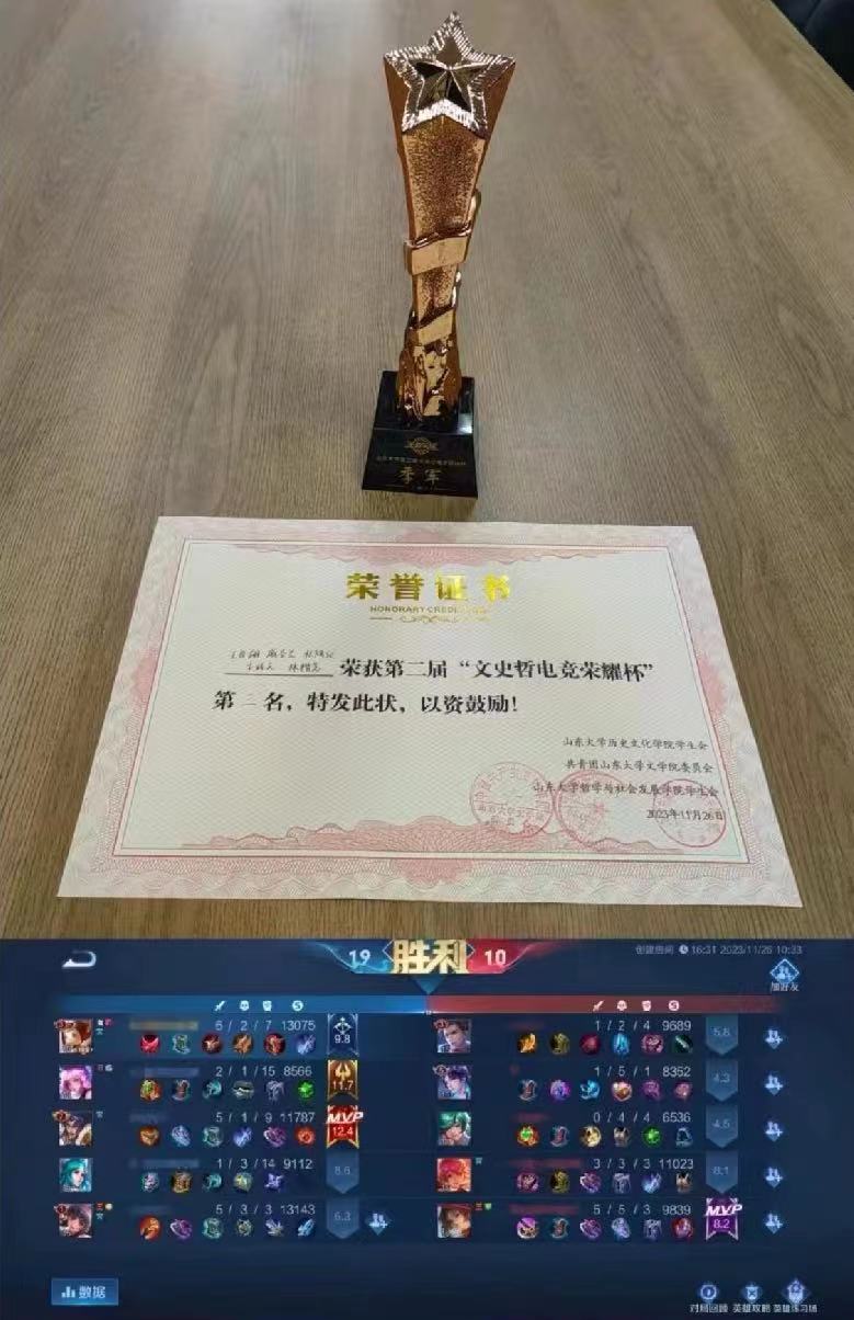 11月,文史哲电竞杯如期举行,参赛选手充分发挥电竞精神,在轻松愉悦的比赛氛围中圆满完成了全部赛程。在众多参赛队伍中,公司“土鸡营”队表现出色,脱颖而出,成功斩获第二届文史哲电竞杯季军。本次比赛使各位选手对于永不言弃的电竞精神有了更为深刻的认知,对于增进同学感情,促进相互合作有重要意义。