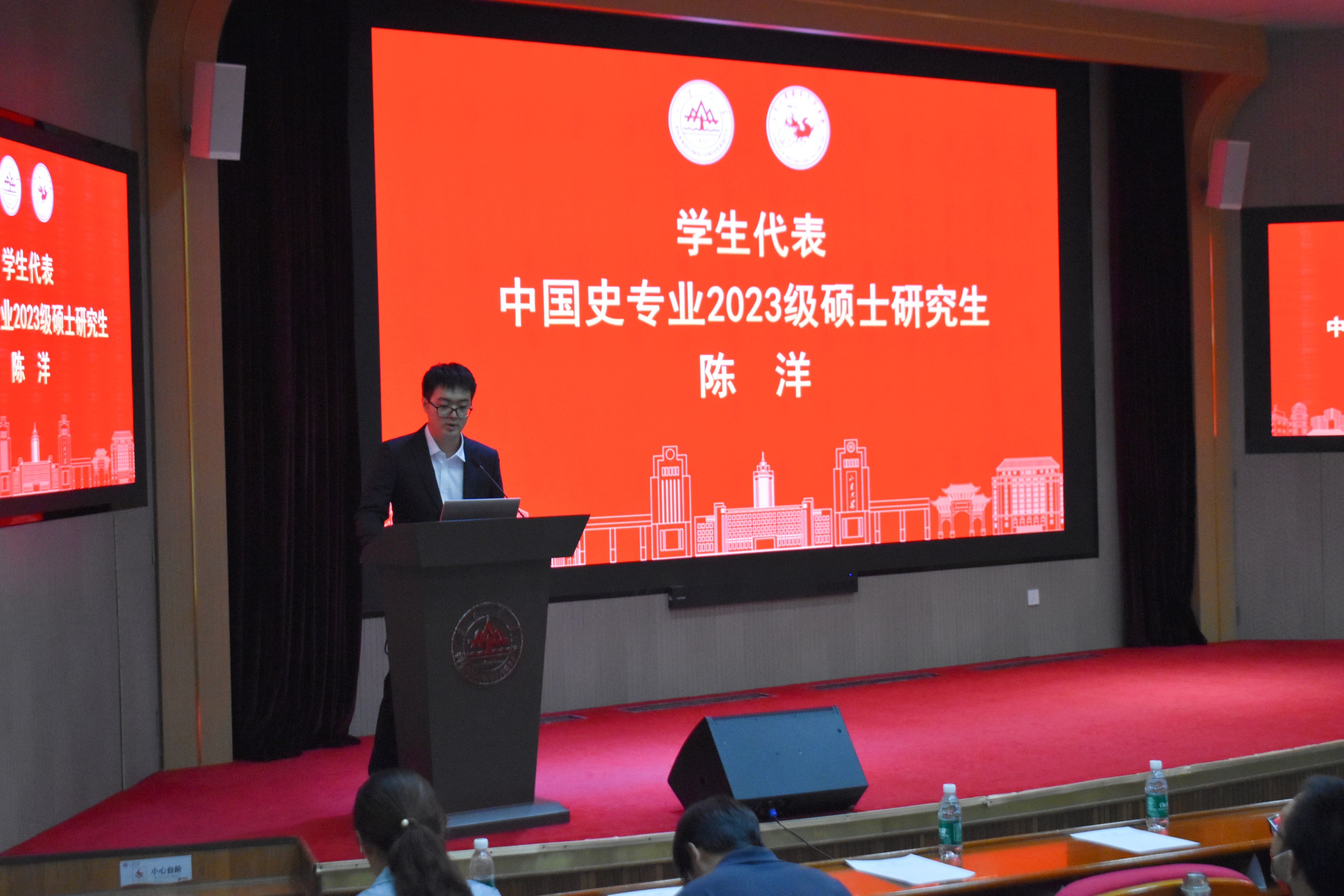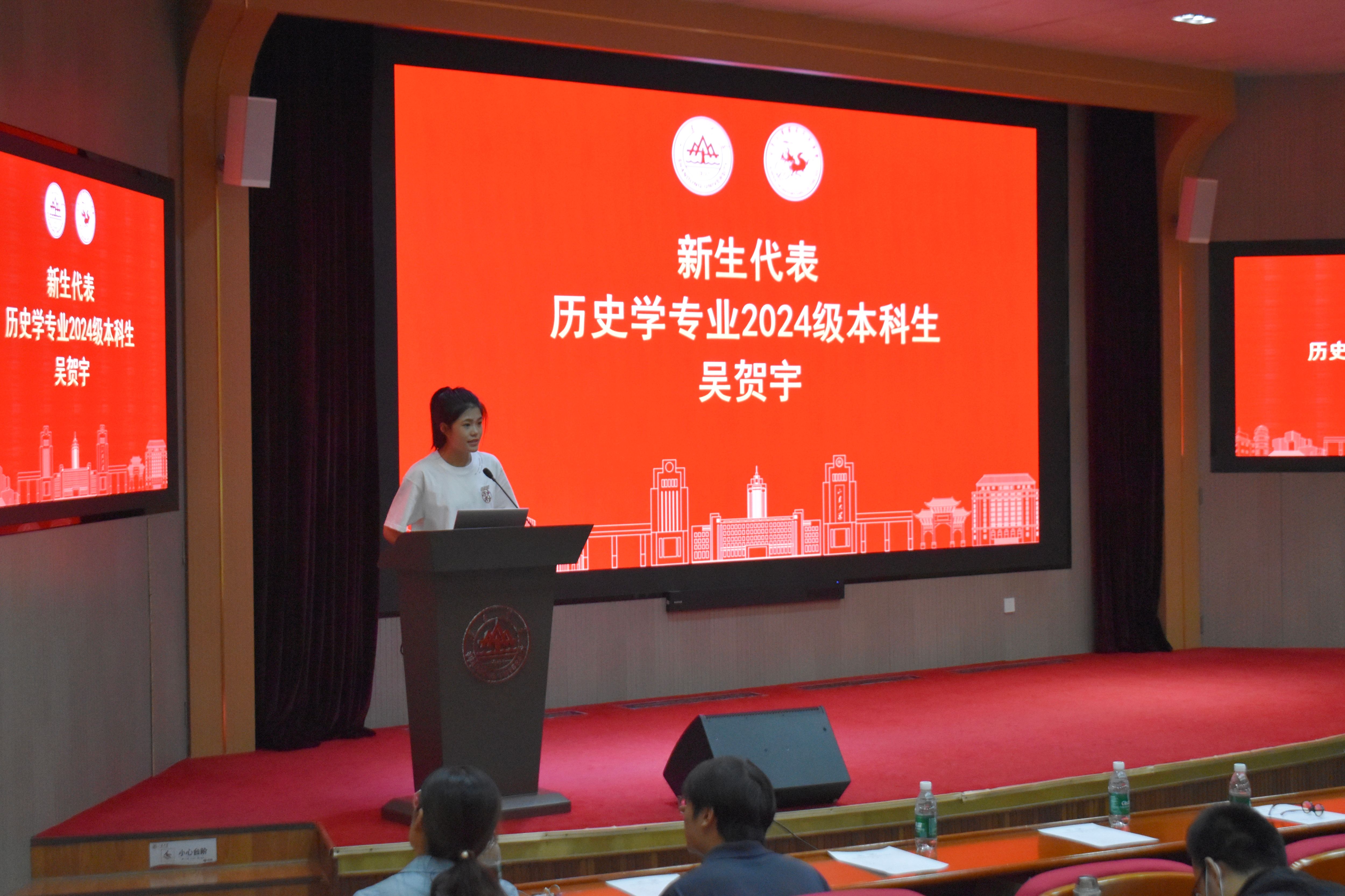 新生代表、2024级本科生吴贺宇分享了初入山大的感受与体验,她表达出自己对未来的学习生活的憧憬与期待,号召来自五湖四海的同学们携手追随梦想,笃定前行,厚积成器,展翅高飞,为历史系的发展增添新的强大动力。