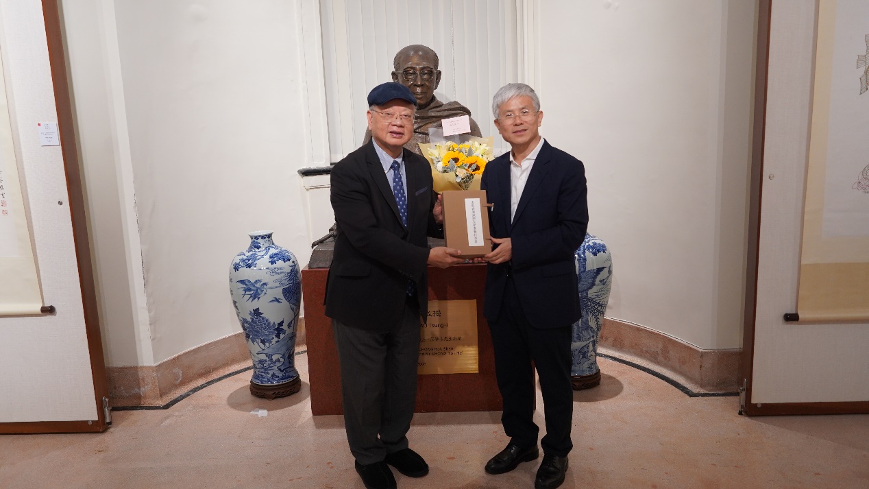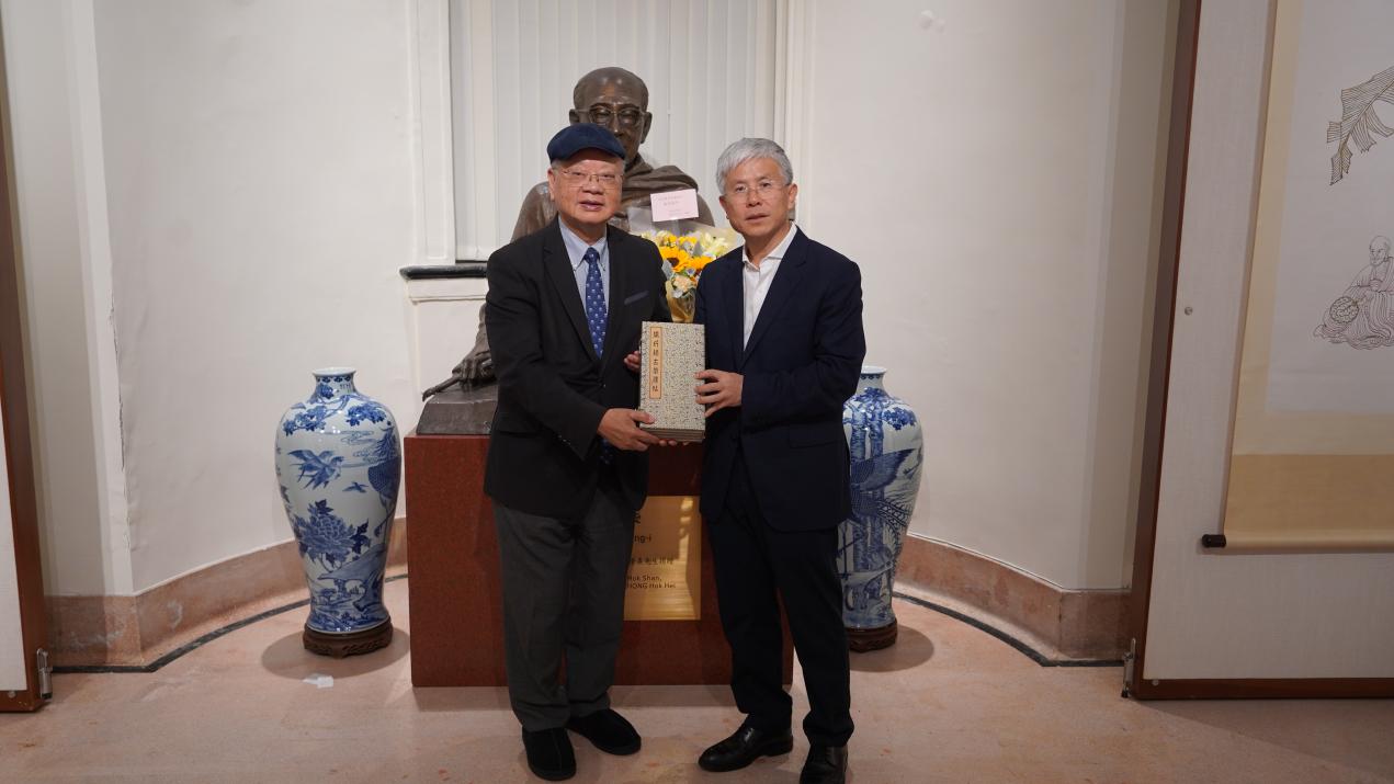 李术才代表sunbet官方网站向饶宗颐塑像敬献鲜花,并在嘉宾留言簿上题词“道德文章垂不朽,清风雅量著平生”。李术才向饶宗颐学术馆和饶学联汇赠送《山东省城试办大学堂暂行章程》《周氏师古堂法帖》和近年公司人文社科领域代表性研究成果。李焯芬向李术才赠送饶宗颐先生《眼底山川》《海上因缘》书画集。