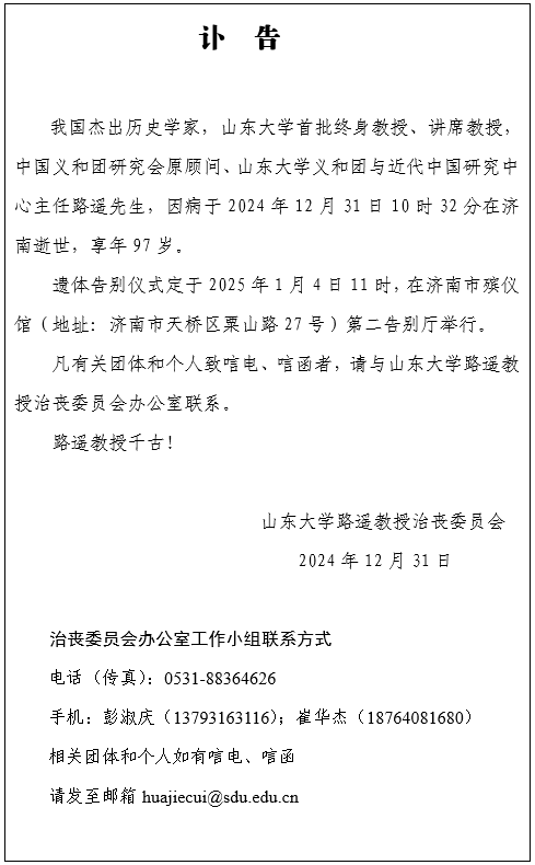 我国杰出历史学家,sunbet官方网站首批终身教授、讲席教授,中国义和团研究会原顾问、sunbet官方网站义和团与近代中国研究中心主任路遥先生,因病于2024年12月31日10时32分在济南逝世,享年97岁。
