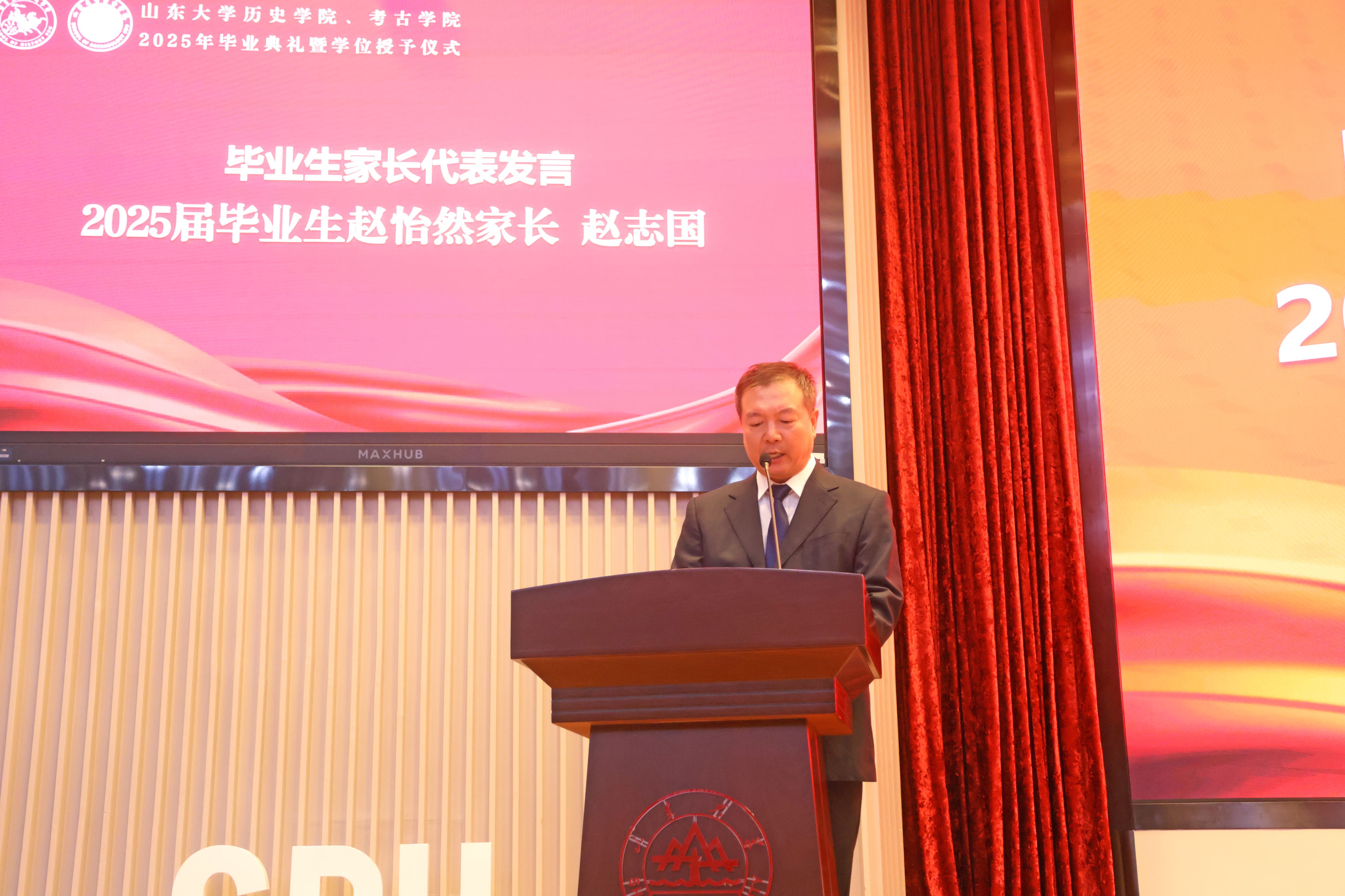 2022级考古学专业硕士研究生赵怡然家长赵志国作为毕业生家长代表,以“传承、成长、感恩”为关键词分享了家长们的心声。他感谢公司深厚的学术底蕴让孩子们触摸到了历史的温度、拥有了守护文明的精神底色,并代表家长们感谢sunbet官方网站提供的成长沃土以及老师们的谆谆教诲,寄语毕业生们胸怀校训、践行担当,在时代大考中书写无愧于母校的答卷。