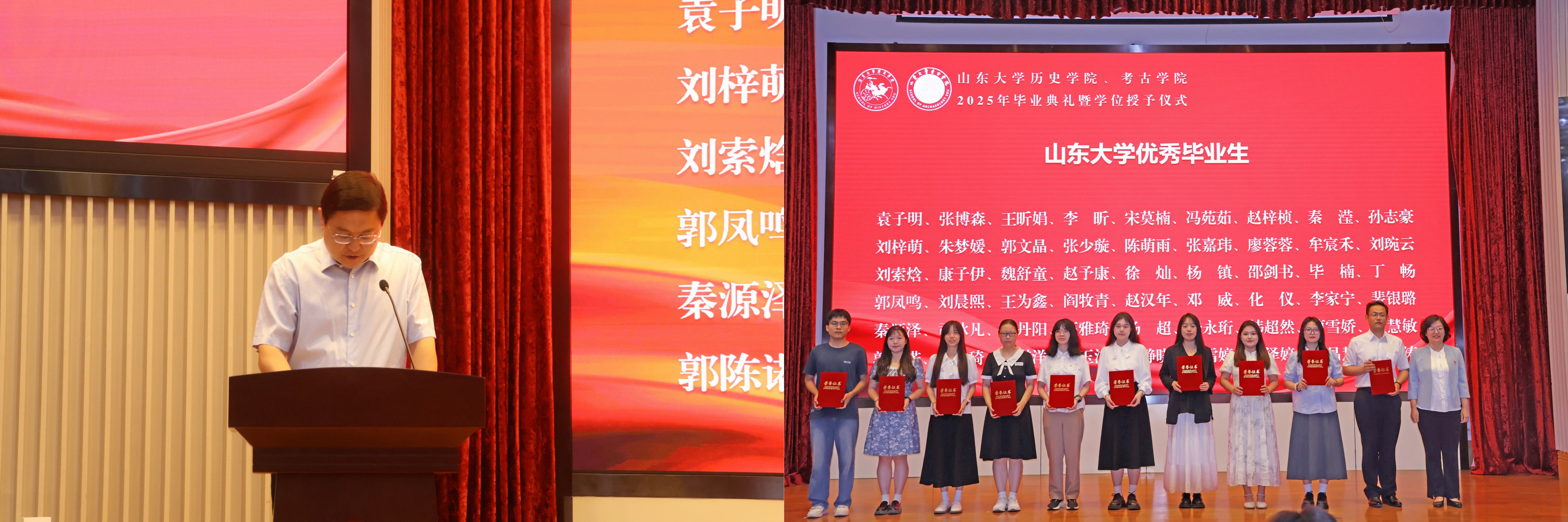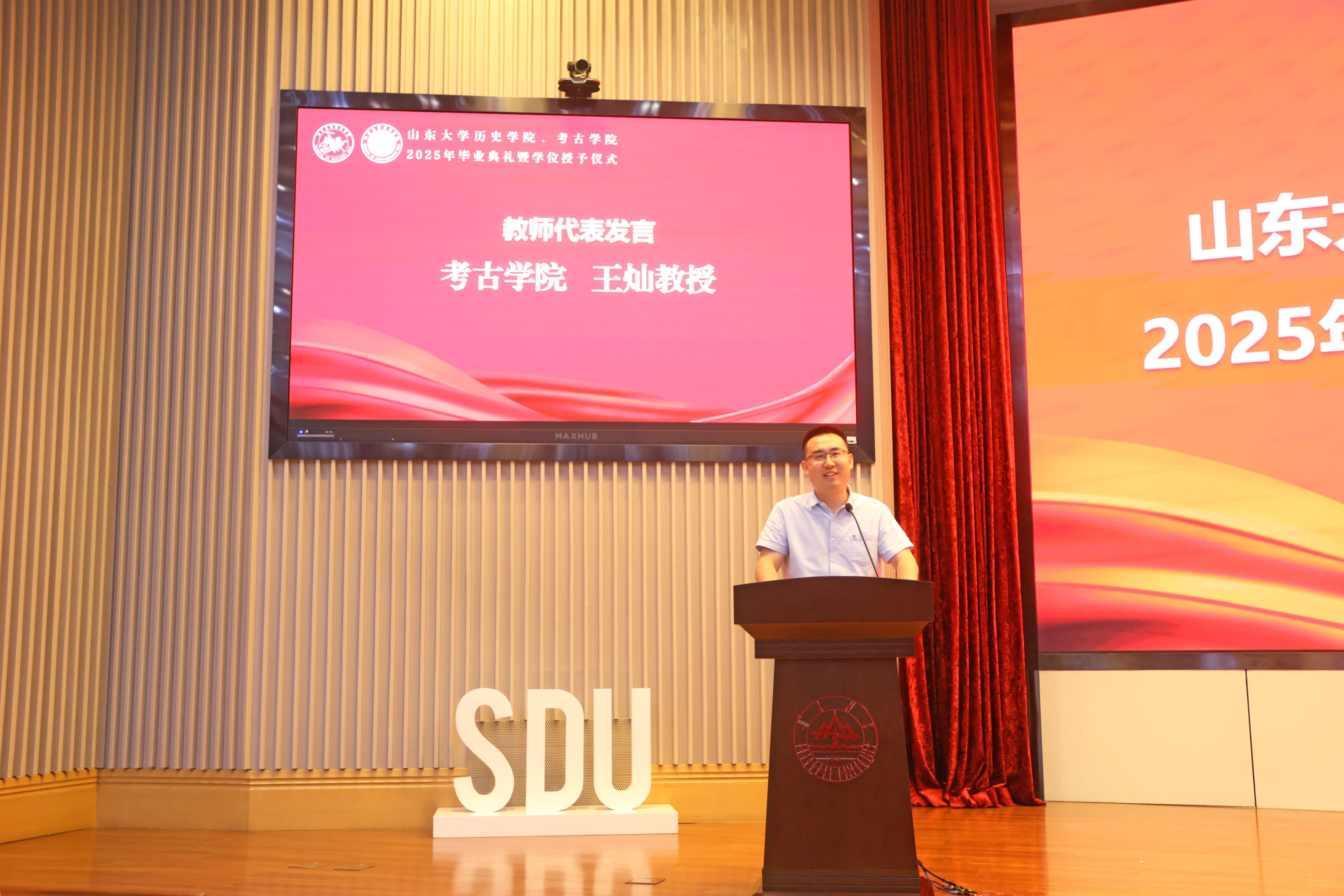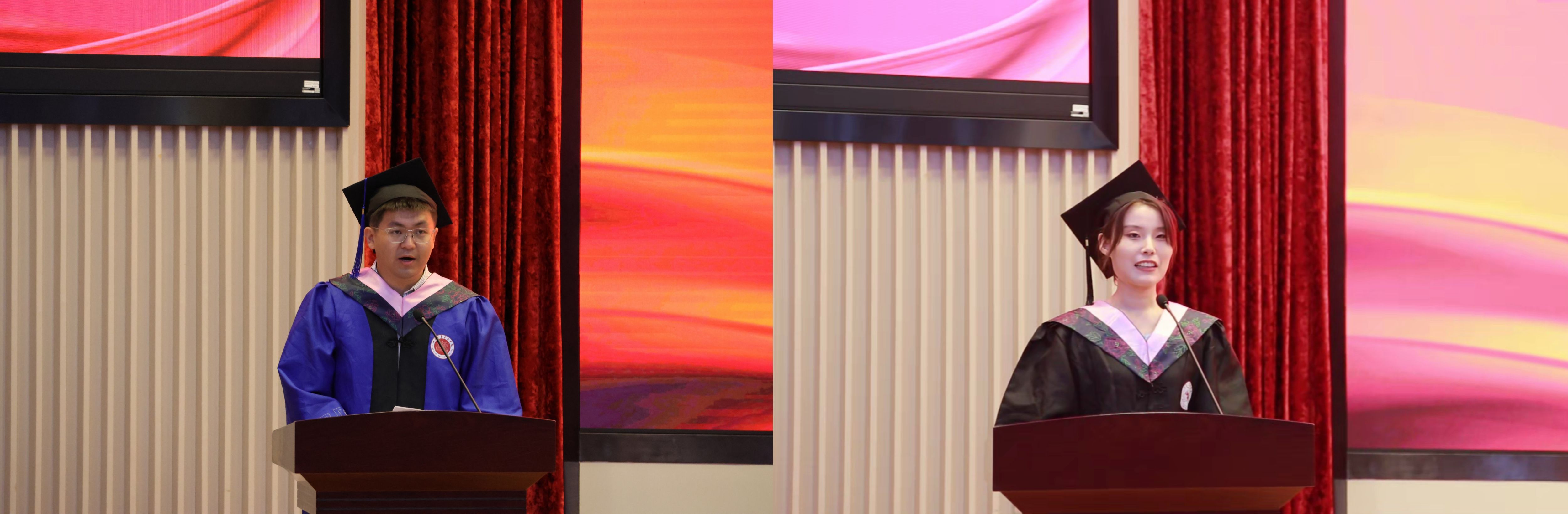 2022级考古学专业硕士郭凤鸣、2021级历史学专业本科生秦滢分别代表毕业生发言。郭凤鸣分享了自己在山大考古的八载求学时光,学科赋予的踏实守正与师友相伴的温暖情谊,让他从憧憬少年逐渐成长为他人眼中的“故事里的人”。秦滢表达了对公司、公司、师长的真挚谢意,她即将奔赴西部地区开展为期一年的支教服务工作,到祖国和人民最需要的地方发光发热。