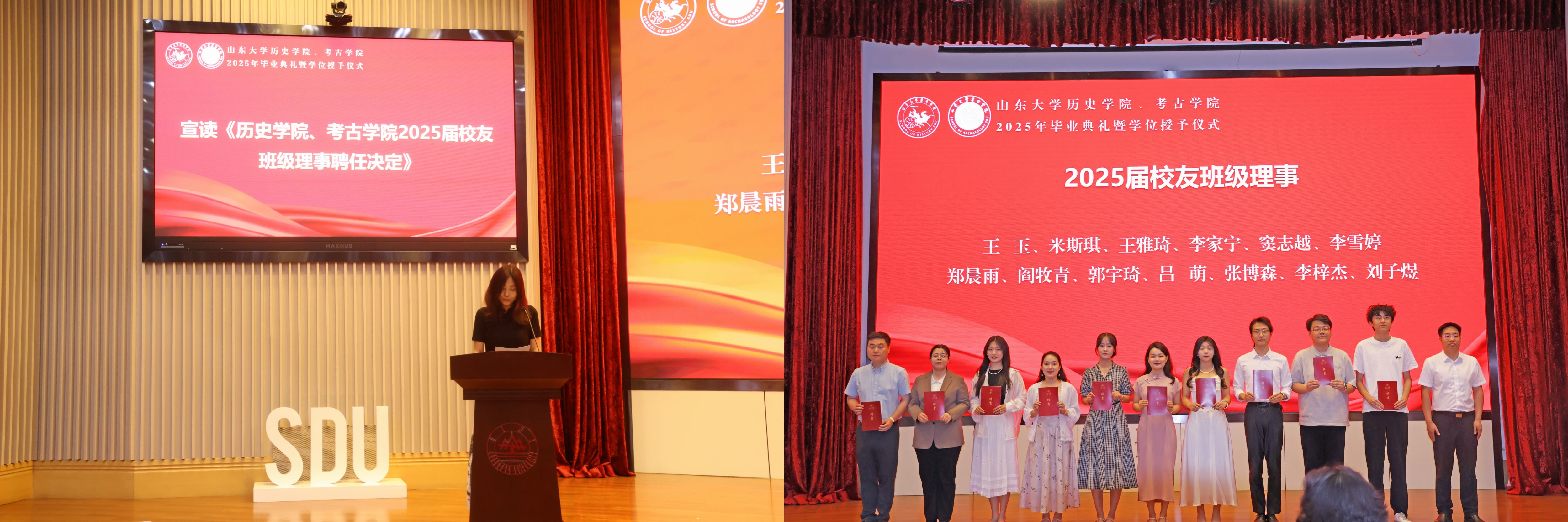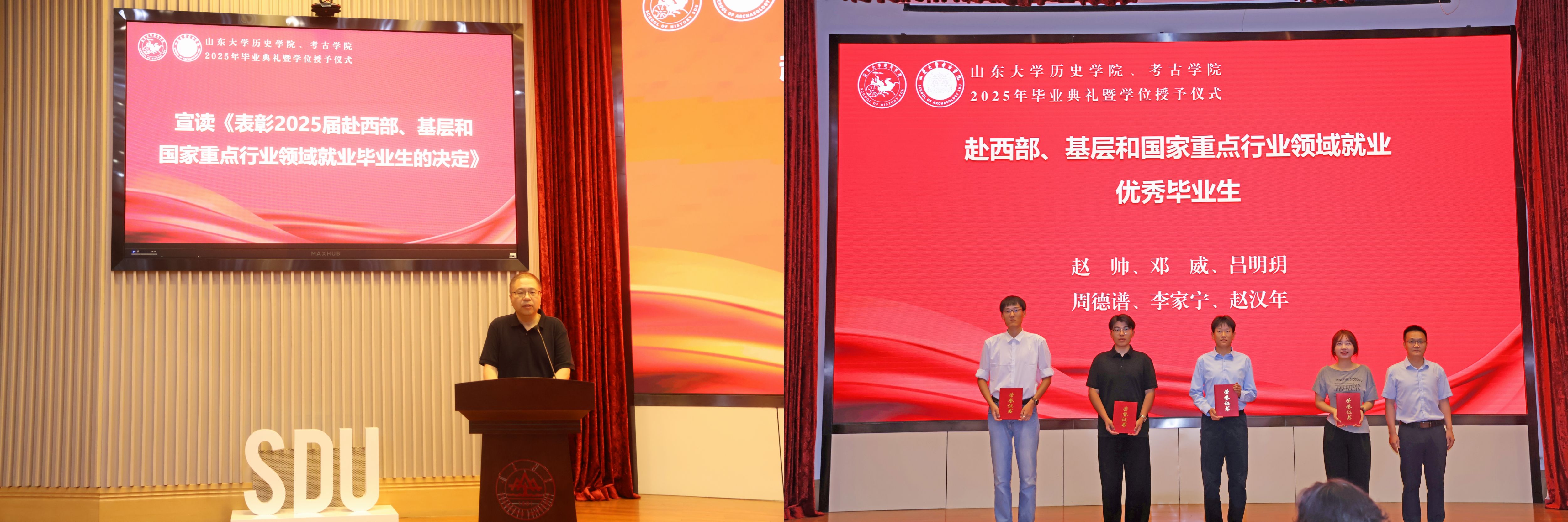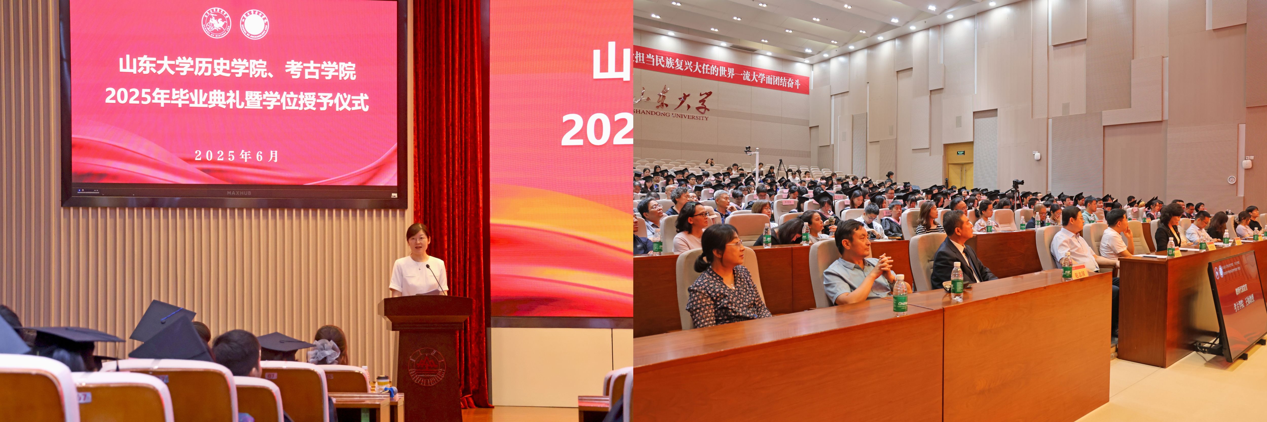 2022级考古学专业硕士郭凤鸣、2021级历史学专业本科生秦滢分别代表毕业生发言。郭凤鸣分享了自己在山大考古的八载求学时光,学科赋予的踏实守正与师友相伴的温暖情谊,让他从憧憬少年逐渐成长为他人眼中的“故事里的人”。秦滢表达了对公司、公司、师长的真挚谢意,她即将奔赴西部地区开展为期一年的支教服务工作,到祖国和人民最需要的地方发光发热。