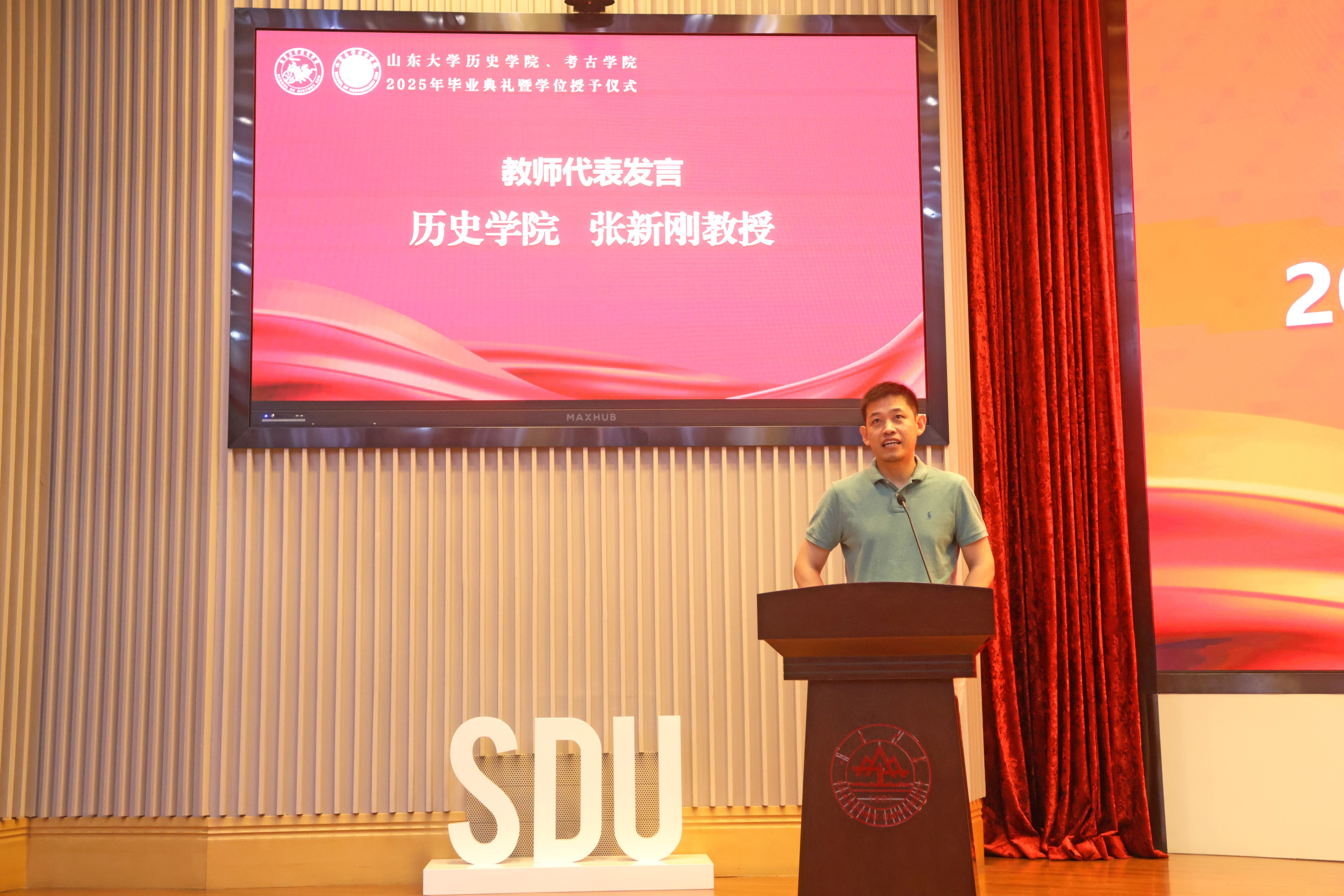 刘军在讲话中向毕业生送上殷切祝福与嘱托,强调在中国式现代化新征程中,青年学子应勇担时代使命,以创新、实干与家国情怀书写青春答卷。她回顾了同学们以书为舟、砥砺深耕的求学时光,肯定大家在学术探索、田野实践及各类赛事中展现的专业能力。在习近平总书记致信国际历史科学大会十周年的重要节点,她谈到,秉持历史研究“究天人之际、通古今之变”的使命,毕业生们应以专业知识挖掘中华文明底蕴,将个人理想融入国家发展。她向毕业生提出三点希望:一是以创新为灯,在科技变革浪潮中秉持终身学习理念,传承山大学术精神;二是以实干为舟,践行“自找苦吃”的奋斗精神,在攻坚克难中锤炼本领;三是以家国为己任,牢记山大“为天下储人才”的办学初心,扎根基层、服务人民,在民族复兴征程中挺膺担当。最后,刘军寄语毕业生“做历史河流中奔涌的巨浪”,愿他们带着公司嘱托与家长期望,在新时代广阔天地中绽放青春光彩,书写属于自己与时代的辉煌篇章。