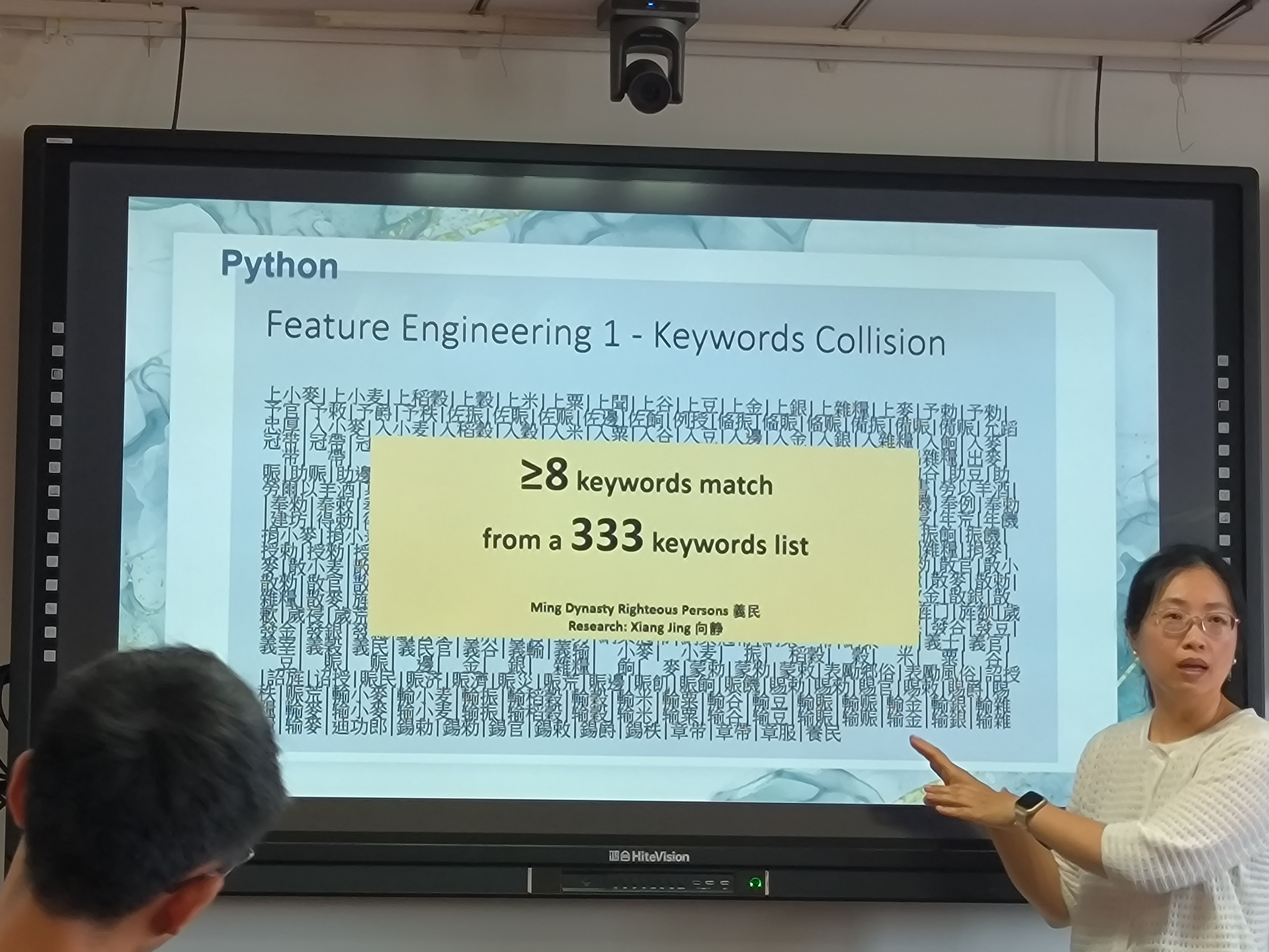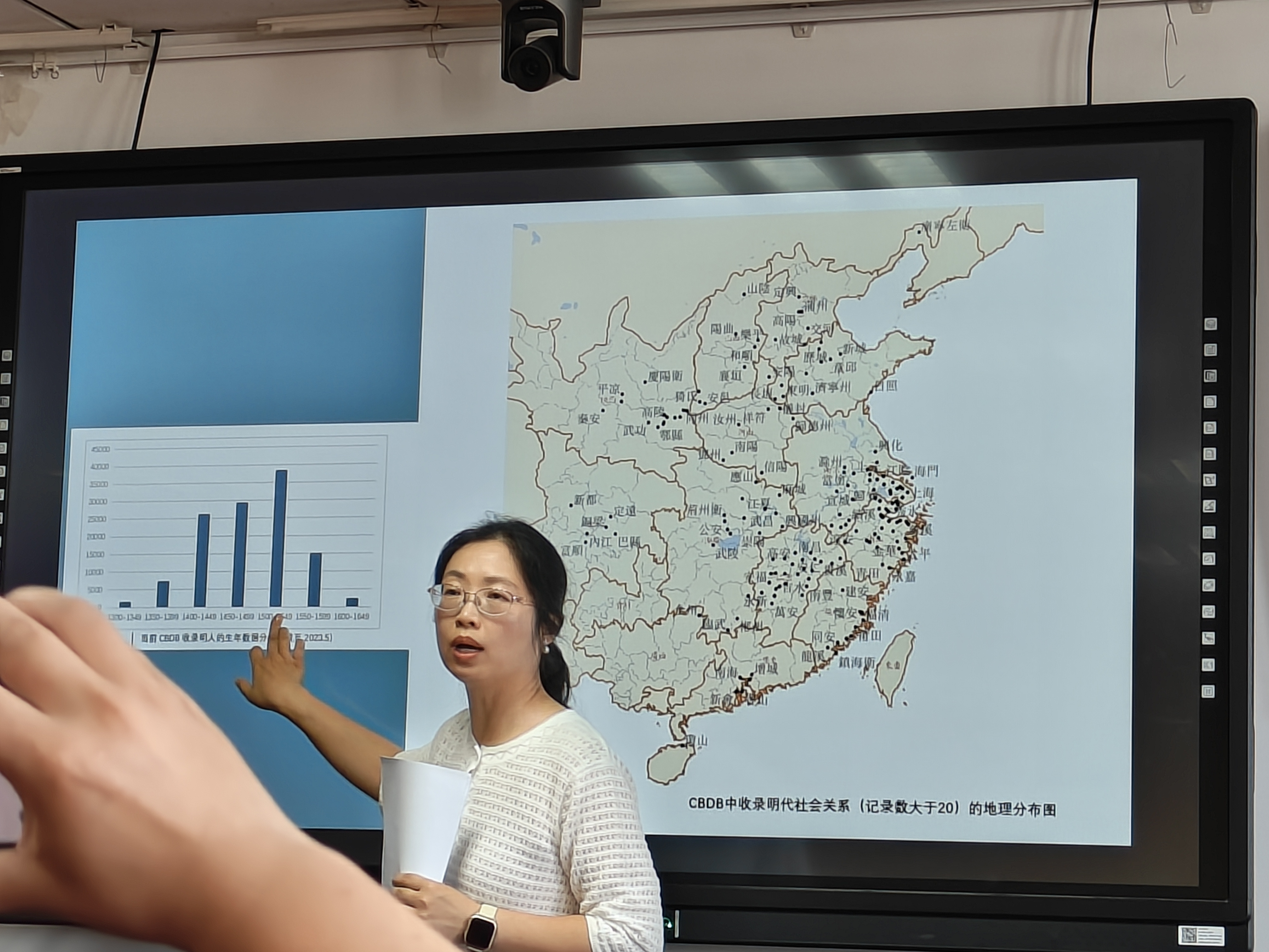 随后,向静向师生们介绍了“中国历代人物传记资料库(CBDB)”、“明人书信计划(MLP)”等知名数据库的数据体量、资料来源、呈现的主要信息及其构建人物关系活动网络的基本技术原理,并以柯荣住、王裕华、包弼德(Peter K. Bol)等学者的量化研究为例,说明量化研究利用数字手段概括和处理信息时较之于阐释性手段的优势以及定量研究在直接资料不足时的“代理”作用。向静还指出,“代理”有没有研究的可信度,本质上是将历史问题量化时需要考虑的层次、逻辑与方法的合理性问题。由此,向静引入数据库建设中的“元数据”概念,并结合吴滔“明代价格数据库”等案例,指出历史数据库的元数据设计应当充分吸收历史学者对于文献内部的结构、层次、关联性的理解力和想象力,使数据库最终服务于研究过程的整体与细节。